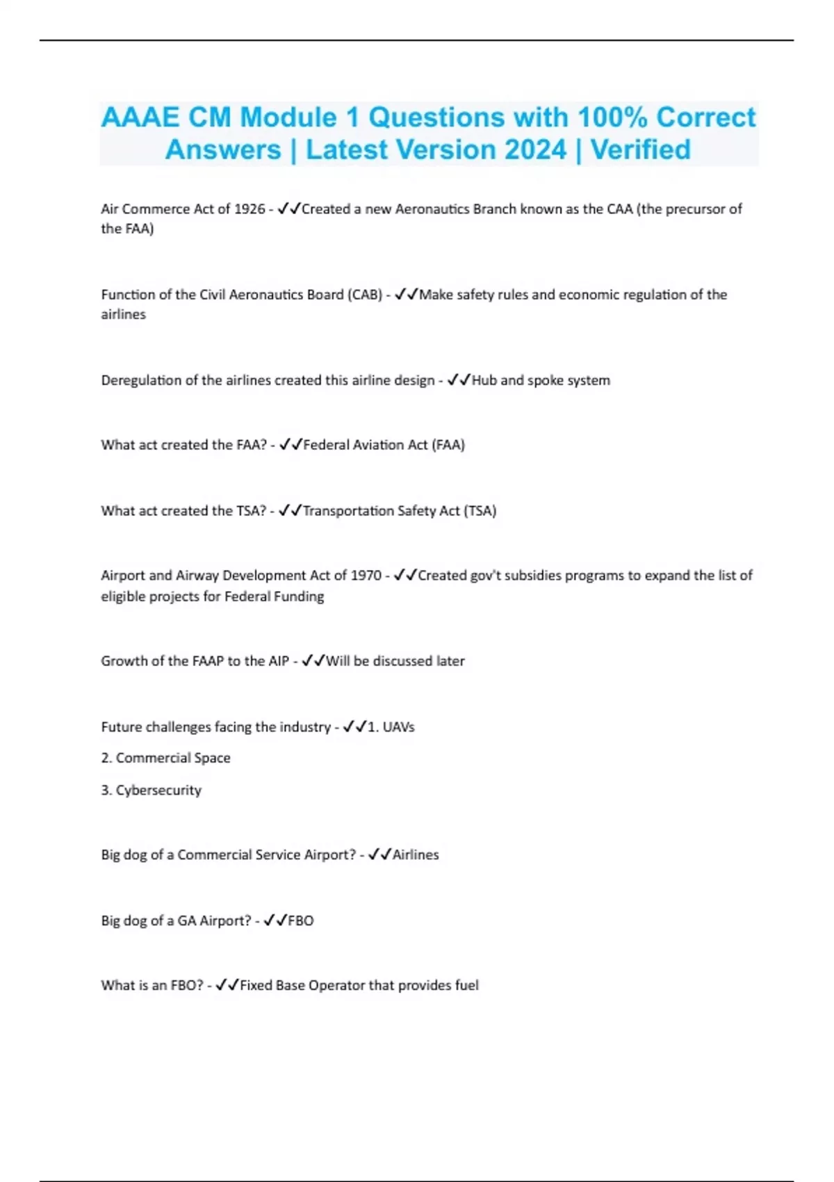 Air Commerce Act of 1926 - Created a new Aeronautics Branch known as the CAA (the precursor of the FAA) Function of the Civil Aeronautics Board (CAB) - Make safety rules and economic regulation of the airlines Deregulation of the airlines created this airline design - Hub and spoke system What act created the FAA? - Federal Aviation Act (FAA) What act created the TSA? - Transportation Safety Act (TSA) Airport and Airway Development Act of 1970 - Created gov't subsidies programs to expand the list of eligible projects for Federal Funding Growth of the FAAP to the AIP - Will be discussed later Future challenges facing the industry - 1. UAVs 2. Commercial Space 3. Cybersecurity Big dog of a Commercial Service Airport? - Airlines Big dog of a GA Airport? - FBO What is an FBO? - Fixed Base Operator that provides fuelWhat is a SASO? - Aeronautical Service that doesn't provide fuel How many airports in the US? - 19,000 ish How many airports are Commercial Service Airports? - Just over 5,000 How many GA airports are there? - Roughly 2,500 What are the significance of these numbers: 2500, 10000 and 3345? - 2,500 - Commercial Service Airport 10,000 - Primary Commercial Service Airport 3,345 - Number of public use airports in NPIAS Purpose of a GA Reliever Airport? - To relieve the GA traffic from a Commercial Service Airport Joint-Use Airport vs. Shared-Use Airport - Joint-Use - military owns the joint and leases space for commercial travel Shared-Use - owned by govt and military and civil Airport share runways and taxiways What is the importance of Part 91, Part 121 and Part 135? - Part 91 - General Aviation Safety Standards Part 121 - Scheduled Airlines Safety Standards (highest)