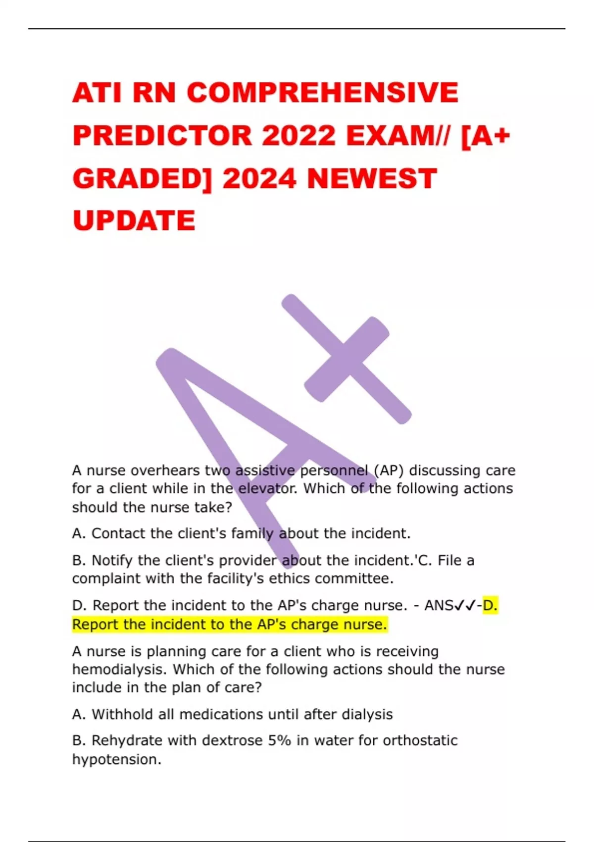 ATI RN COMPREHENSIVE PREDICTOR 2022 EXAM// [A+ GRADED] 2024 NEWEST UPDATE A nurse overhears two assistive personnel (AP) discussing care for a client while in the elevator. Which of the following actions should the nurse take? A. Contact the client's family about the incident. B. Notify the client's provider about the incident.'C. File a complaint with the facility's ethics committee. D. Report the incident to the AP's charge nurse. - ANS-D. Report the incident to the AP's charge nurse. A nurse is planning care for a client who is receiving hemodialysis. Which of the following actions should the nurse include in the plan of care? A. Withhold all medications until after dialysis B. Rehydrate with dextrose 5% in water for orthostatic hypotension. C. Check the vascular access site for bleeding after dialysis. D. Give an antibiotic 30 min before dialysis. - ANS-C. Check the vascular access site for bleeding after dialysis. A nurse in the emergency department is caring for a client who reports intimate partner violence. Which of the following interventions is the nurse's priority? A. Develop a safety plan with the client B. (Unable) options for reporting the incident. C. Refer the client to a community support group. D. Determine if the client has any injuries. - ANS-D. Determine if the client has any injuries. A nurse is caring for a client who is in active labor and note the FHR baseline has been 100/min for the past 15 min. The nurse should identify which of the following conditions as a possible cause of fetal bradycardia? A. Maternal fever B. Fetal anemia C. Maternal hypoglycemia D. Chorioamnionitis - ANS-C. Maternal hypoglycemia A nurse is assessing a school-age child who has a urinary tract infection. Which of the following findings should the nurse expect? A. Periorbital edema. B. Decreased frequency of urination. C. Enuresis. D. Diarrhea. - ANS-C. Enuresis. A nurse is caring for a client who is in active labor and requests pain management. Which of the following actions should the nurse take? A. Administer ondansetron. B. Place the client in a warm shower. C. Apply fundal pressure during contractions. D. Assist the client to a supine position. - ANS-B. Place the client in a warm shower. A nurse in an emergency department is performing triage for multiple clients following a disaster in the community. To which of the following types of injuries should the nurse assign the highest priority? Below-the knee amputation Fractured tibia 95% full-thickness body burn 10cm (4in) laceration to the forearm - ANS-Below-the knee amputation a nurse manager is updating protocols for the use of belt restraints. Which of the following guidelines should the nurse include? Remove the client's restraint every 4hr Document the client's condition every 15 min Attach the restrain to the bed's side rails Request a PRN restrain prescription for clients who are aggressive - ANS-Document the client's condition every 15 min A nurse is teaching an in-service about nursing leadership. Which of the following information should the nurse include about an effective leader? Acts as an advocate for the nursing unit. (Unable to read) for the unit Priorities staff request over client needs. Provides routine client care and documentation. - ANS-Acts as an advocate for the nursing unit. A nurse is reviewing the laboratory findings of a client who has diabetes mellitus and reports that she has been following her (unable to read) care. The nurse should identify which of the following findings indicates a need to revise the client's plan of care. Serum sodium 144 mEq/ (Unable to read) Hba1c10% Random serum glucose 190 mg/dl. - ANS-Hba1c10%