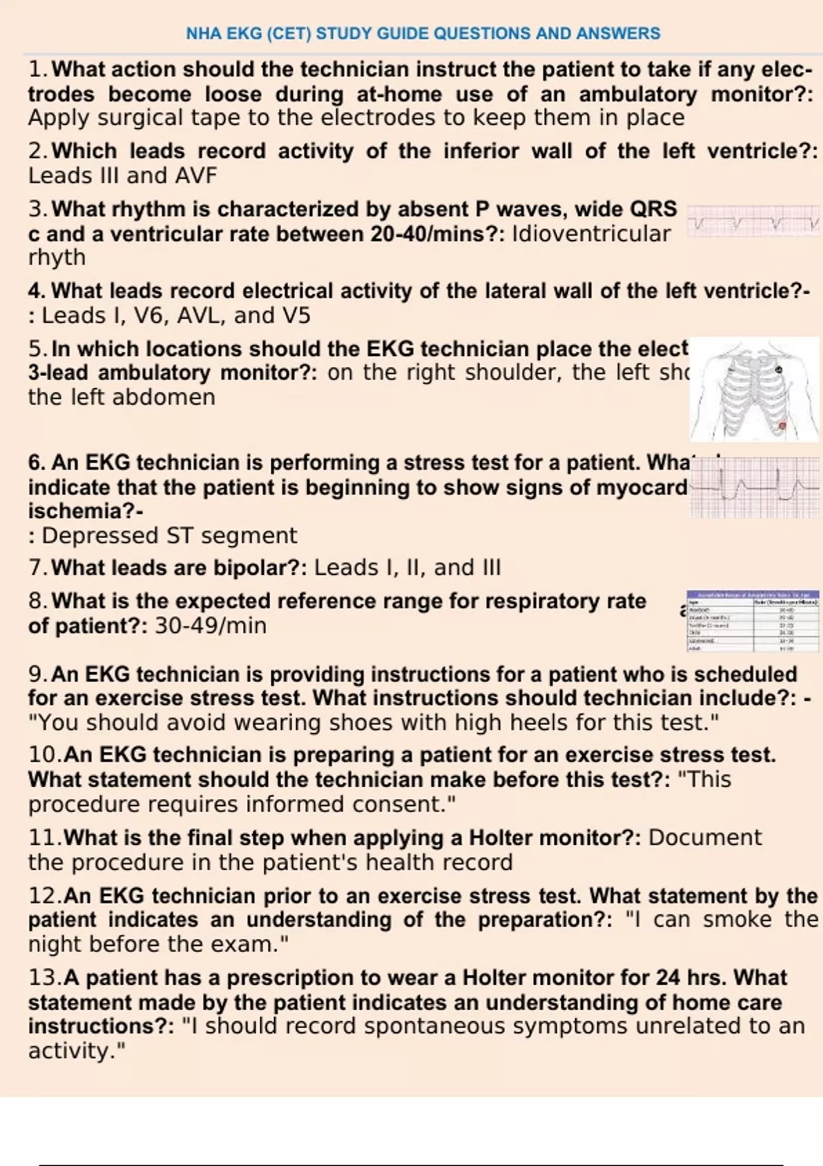 NHA EKG (CET) STUDY GUIDE QUESTIONS AND ANSWERS 1. What action should the technician instruct the patient to take if any elec- trodes become loose during at-home use of an ambulatory monitor?: Apply surgical tape to the electrodes to keep them in place