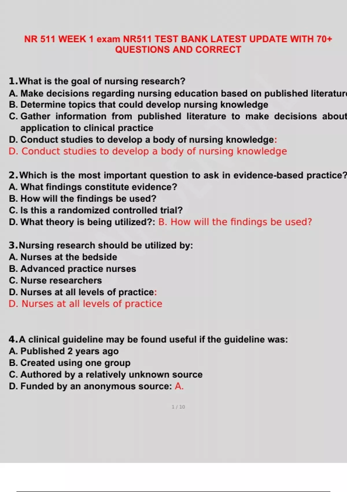 NR 511 WEEK 1 exam NR511 TEST BANK LATEST UPDATE WITH 70+ QUESTIONS AND CORRECT 1. What is the goal of nursing research? A. Make decisions regarding nursing education based on published literature B. Determine topics that could develop nursing knowledge C. Gather information from published literature to make decisions about application to clinical practice D. Conduct studies to develop a body of nursing knowledge