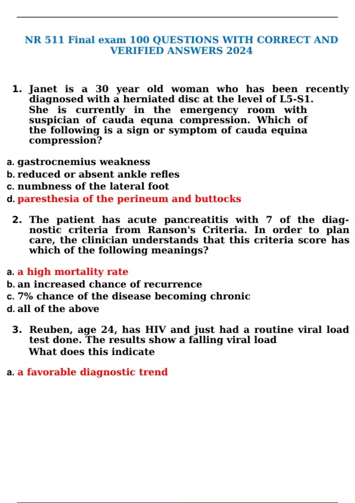 NR 511 Final exam 100 QUESTIONS WITH CORRECT AND VERIFIED ANSWERS 2024 1. Janet is a 30 year old woman who has been recently diagnosed with a herniated disc at the level of L5-S1. She is currently in the emergency room with suspician of cauda equna compression. Which of the following is a sign or symptom of cauda equina compression?