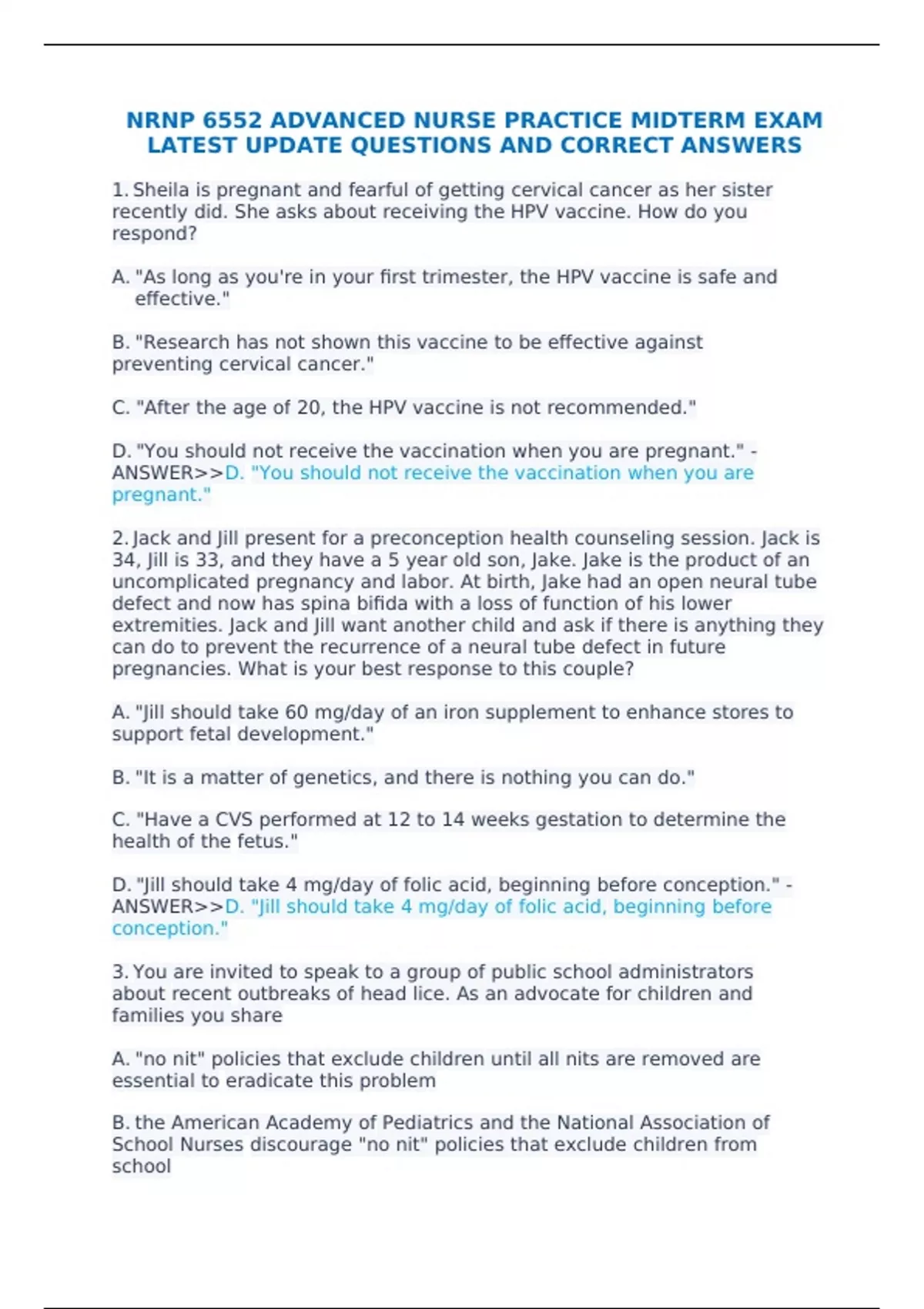 NRNP 6552 ADVANCED NURSE PRACTICE MIDTERM EXAM LATEST UPDATE QUESTIONS AND CORRECT ANSWERS 1. Sheila is pregnant and fearful of getting cervical cancer as her sister recently did. She asks about receiving the HPV vaccine. How do you respond? A. "As long as you're in your first trimester, the HPV vaccine is safe and effective." B. "Research has not shown this vaccine to be effective against preventing cervical cancer." C. "After the age of 20, the HPV vaccine is not recommended." D. "You should not receive the vaccination when you are pregnant." - ANSWER>>D. "You should not receive the vaccination when you are pregnant."