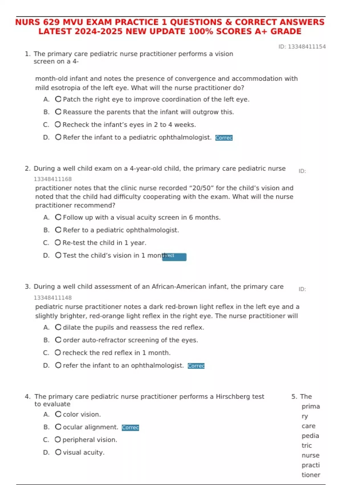 NURS 629 MVU EXAM PRACTICE 1 QUESTIONS & CORRECT ANSWERS LATEST NEW UPDATE 100% SCORES A+ GRADE 1. The primary care pediatric nurse practitioner performs a vision screen on a 4- ID: month-old infant and notes the presence of convergence and accommodation with mild esotropia of the left eye. What will the nurse practitioner do? A. Patch the right eye to improve coordination of the left eye. B. Reassure the parents that the infant will outgrow this. C. Recheck the infant’s eyes in 2 to 4 weeks. D. Refer the infant to a pediatric ophthalmologist. Correc