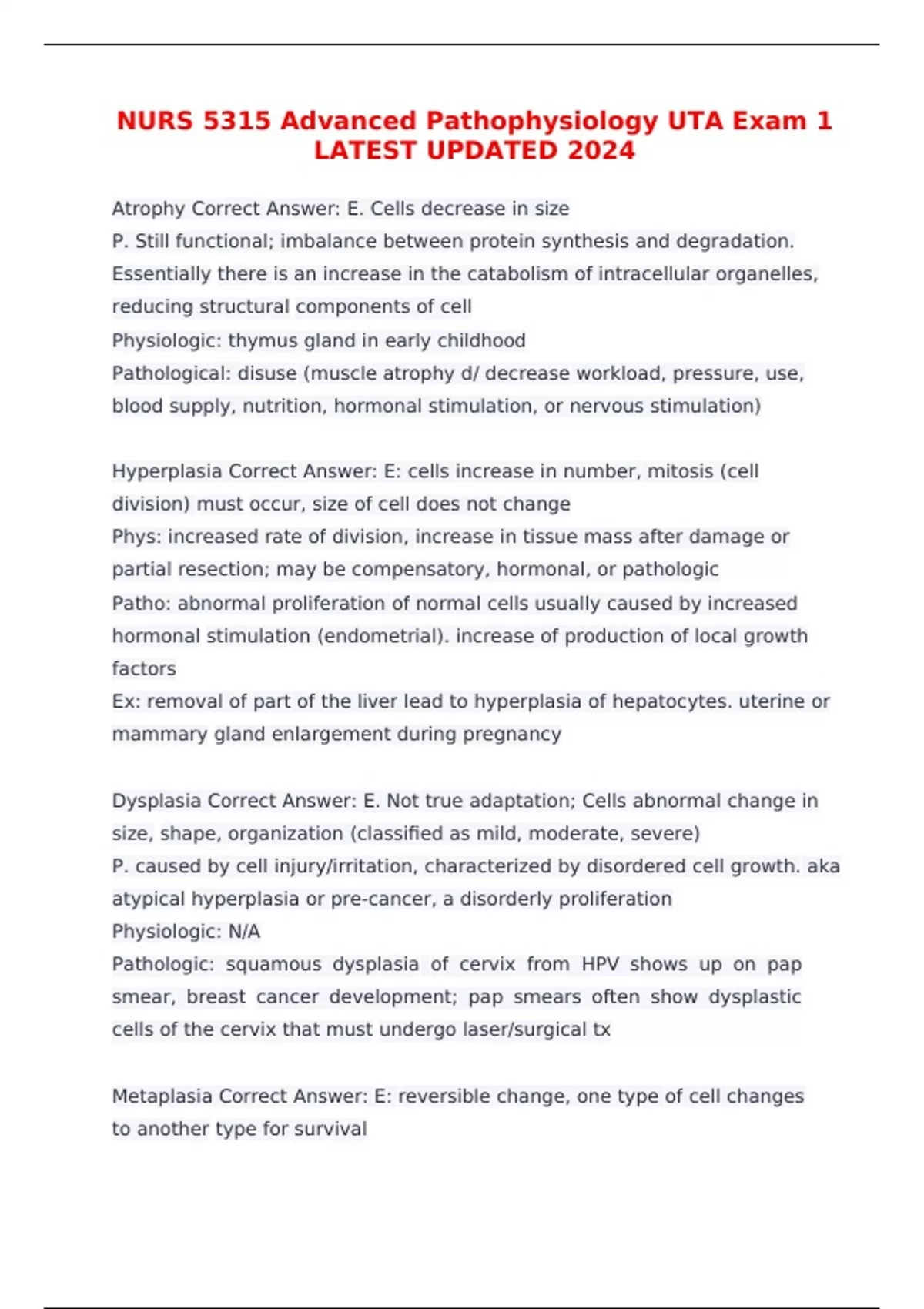 NURS 5315 Advanced Pathophysiology UTA Exam 1 LATEST UPDATED 2024 Atrophy Correct Answer: E. Cells decrease in size P. Still functional; imbalance between protein synthesis and degradation. Essentially there is an increase in the catabolism of intracellular organelles, reducing structural components of cell Physiologic: thymus gland in early childhood Pathological: disuse (muscle atrophy d/ decrease workload, pressure, use, blood supply, nutrition, hormonal stimulation, or nervous stimulation)