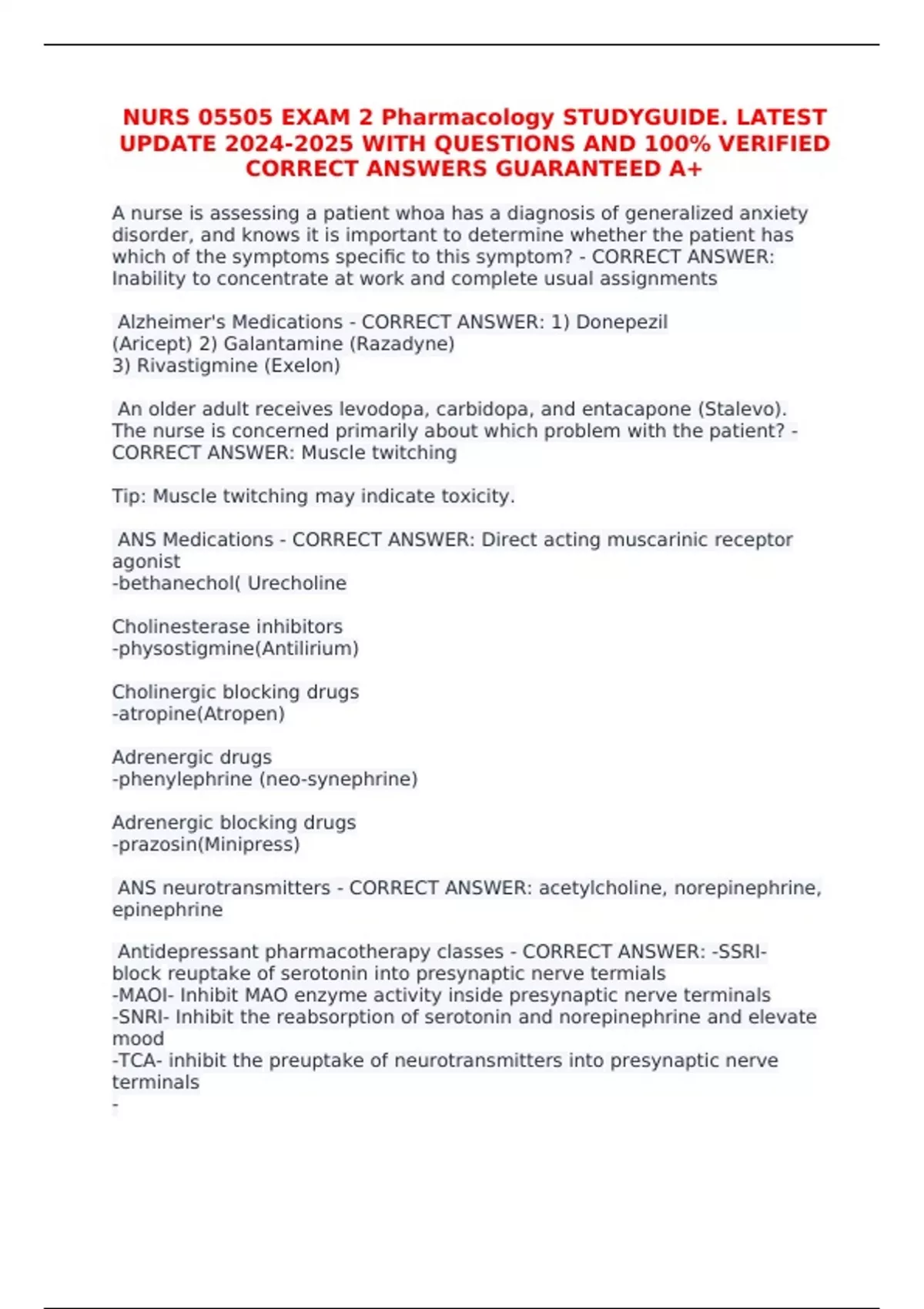 NURS 05505 EXAM 2 Pharmacology STUDYGUIDE. LATEST UPDATE WITH QUESTIONS AND 100% VERIFIED CORRECT ANSWERS GUARANTEED A+ A nurse is assessing a patient whoa has a diagnosis of generalized anxiety disorder, and knows it is important to determine whether the patient has which of the symptoms specific to this symptom? - CORRECT ANSWER: Inability to concentrate at work and complete usual assignments
