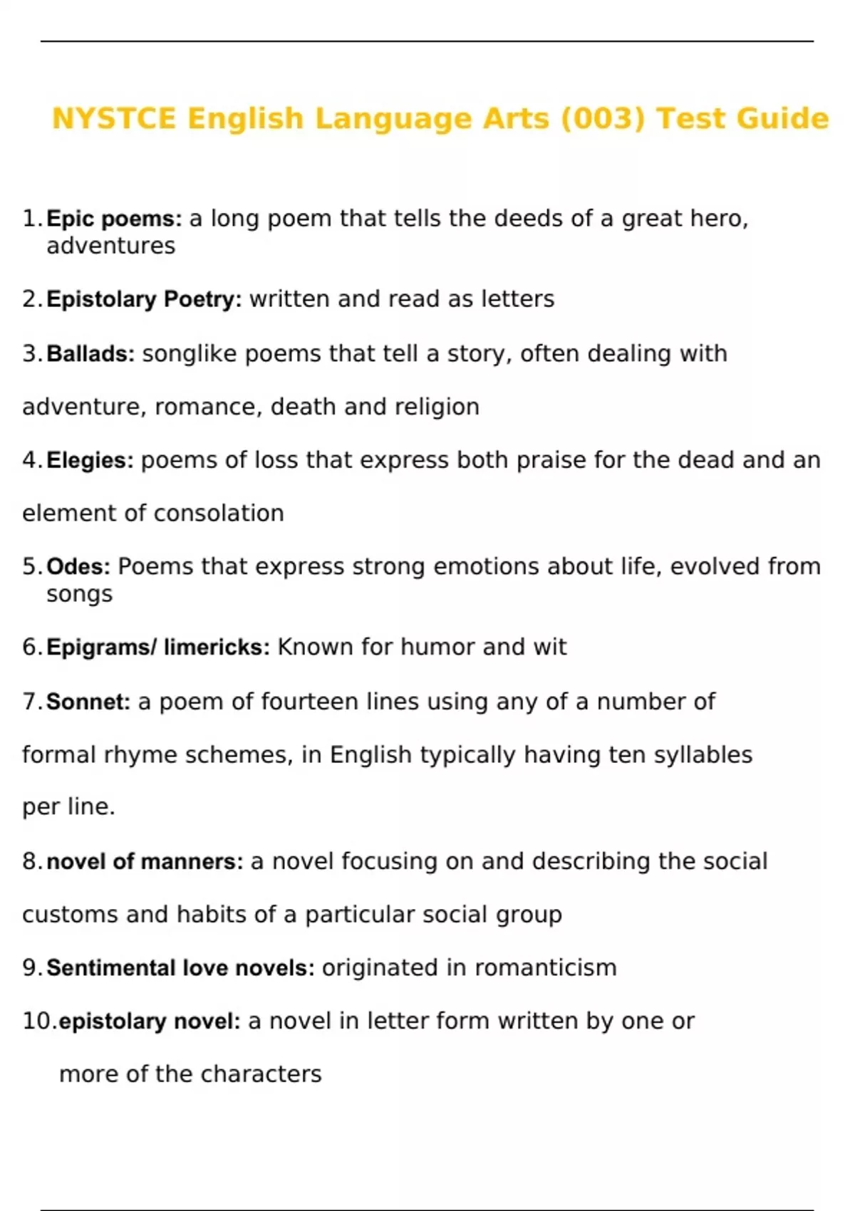 NYSTCE English Language Arts (003) Test Guide 1. Epic poems: a long poem that tells the deeds of a great hero, adventures