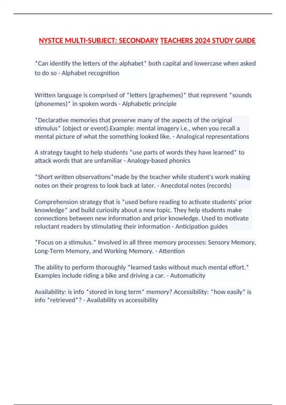 NYSTCE MULTI-SUBJECT: SECONDARY TEACHERS 2024 STUDY GUIDE *Can identify the letters of the alphabet* both capital and lowercase when asked to do so - Alphabet recognition