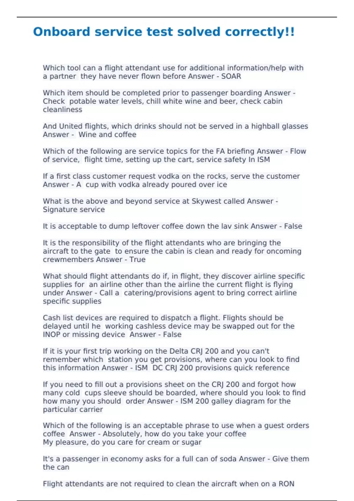 Onboard service test solved correctly!! Which tool can a flight attendant use for additional information/help with a partner they have never flown before Answer - SOAR