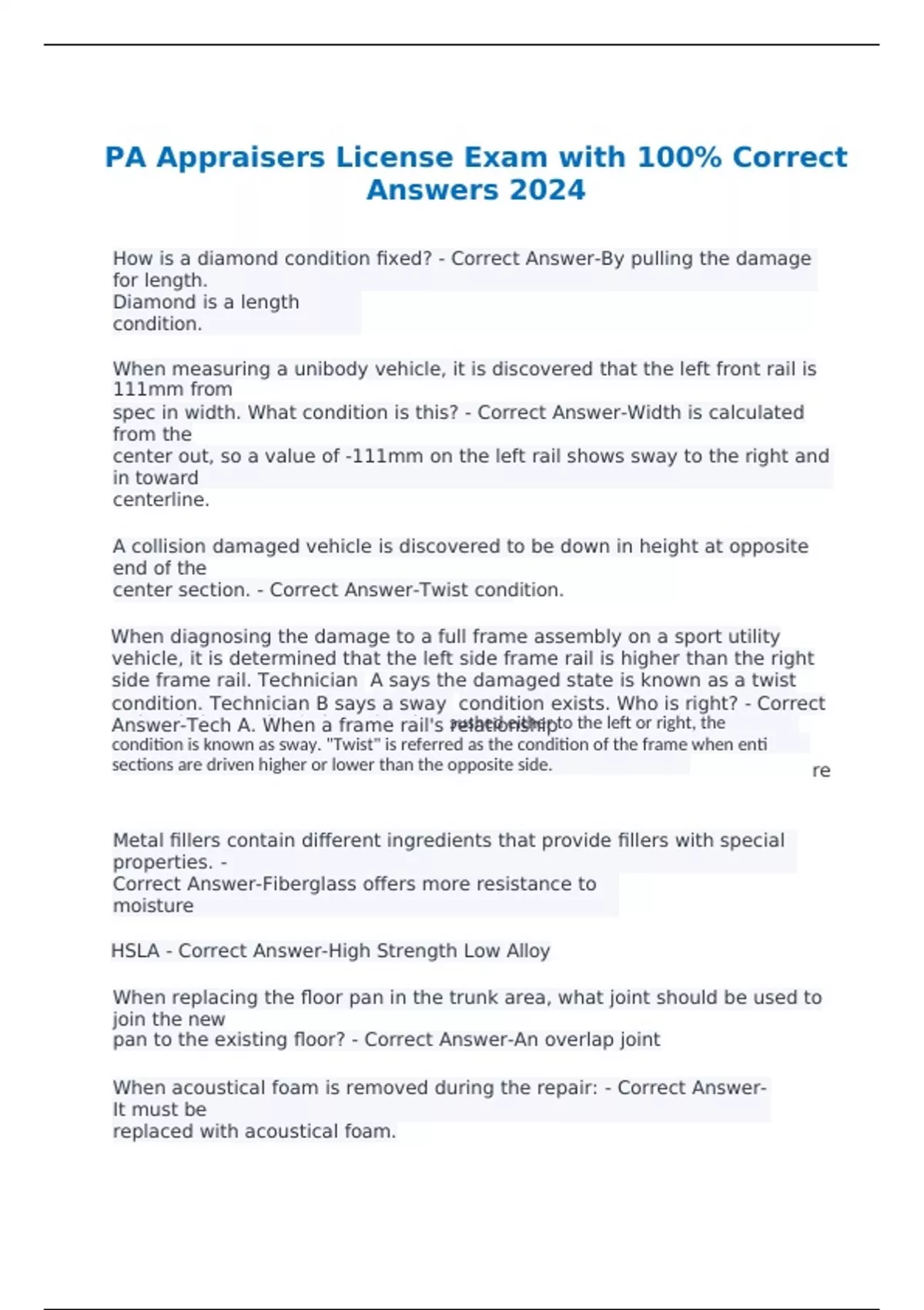 PA Appraisers License Exam with 100% Correct Answers 2024 How is a diamond condition fixed? - Correct Answer-By pulling the damage for length. Diamond is a length condition.