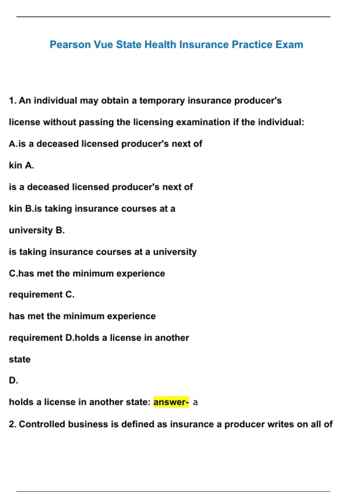 Pearson Vue State Health Insurance Practice Exam 1. An individual may obtain a temporary insurance producer's license without passing the licensing examination if the individual: A. is a deceased licensed producer's next of kin A. is a deceased licensed producer's next of kin B.is taking insurance courses at a university B. is taking insurance courses at a university C.has met the minimum experience requirement C. has met the minimum experience requirement D.holds a license in another state D. holds a license in another state: answer- a