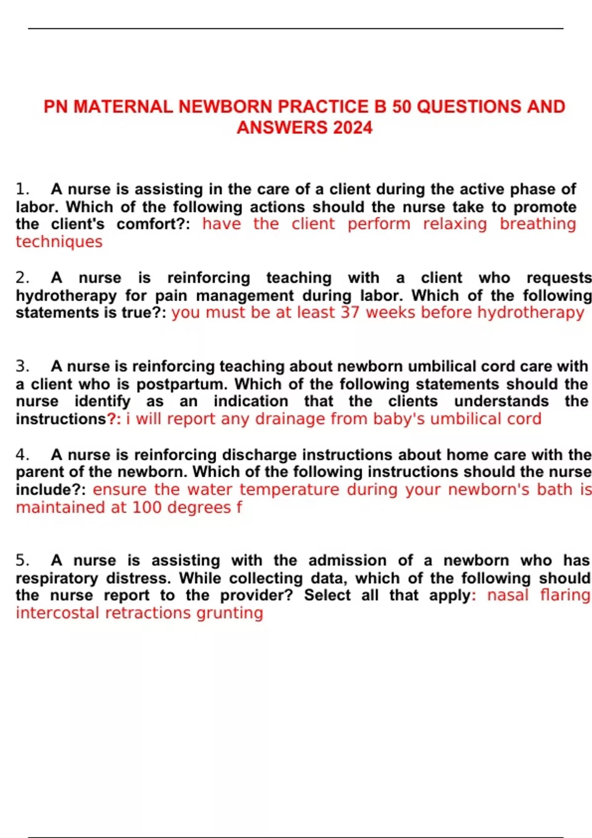 PN MATERNAL NEWBORN PRACTICE B 50 QUESTIONS AND ANSWERS 2024