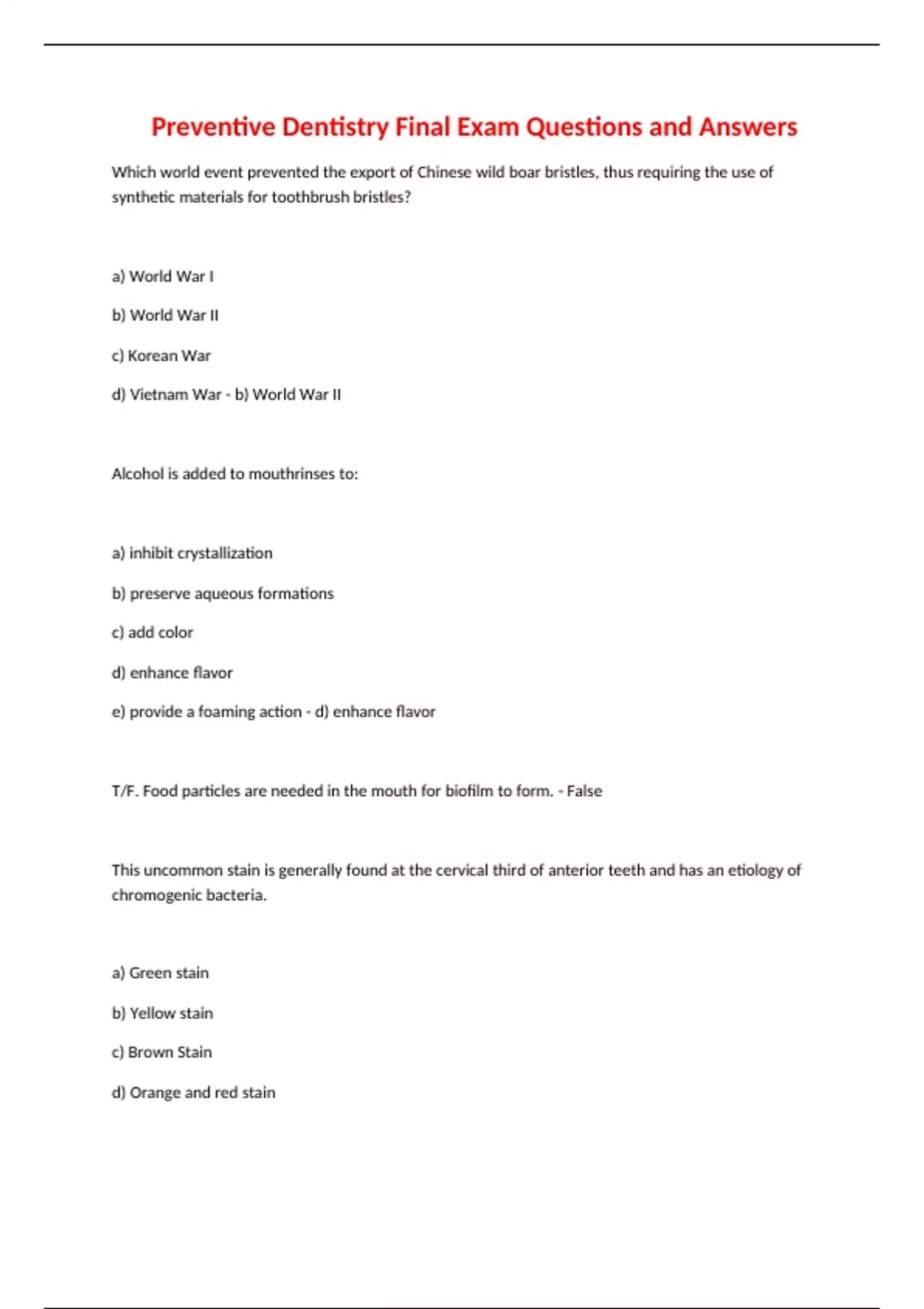 Preventive Dentistry Final Exam Questions and Answers Which world event prevented the export of Chinese wild boar bristles, thus requiring the use of synthetic materials for toothbrush bristles? a) World War I b) World War II c) Korean War d) Vietnam War - b) World War II