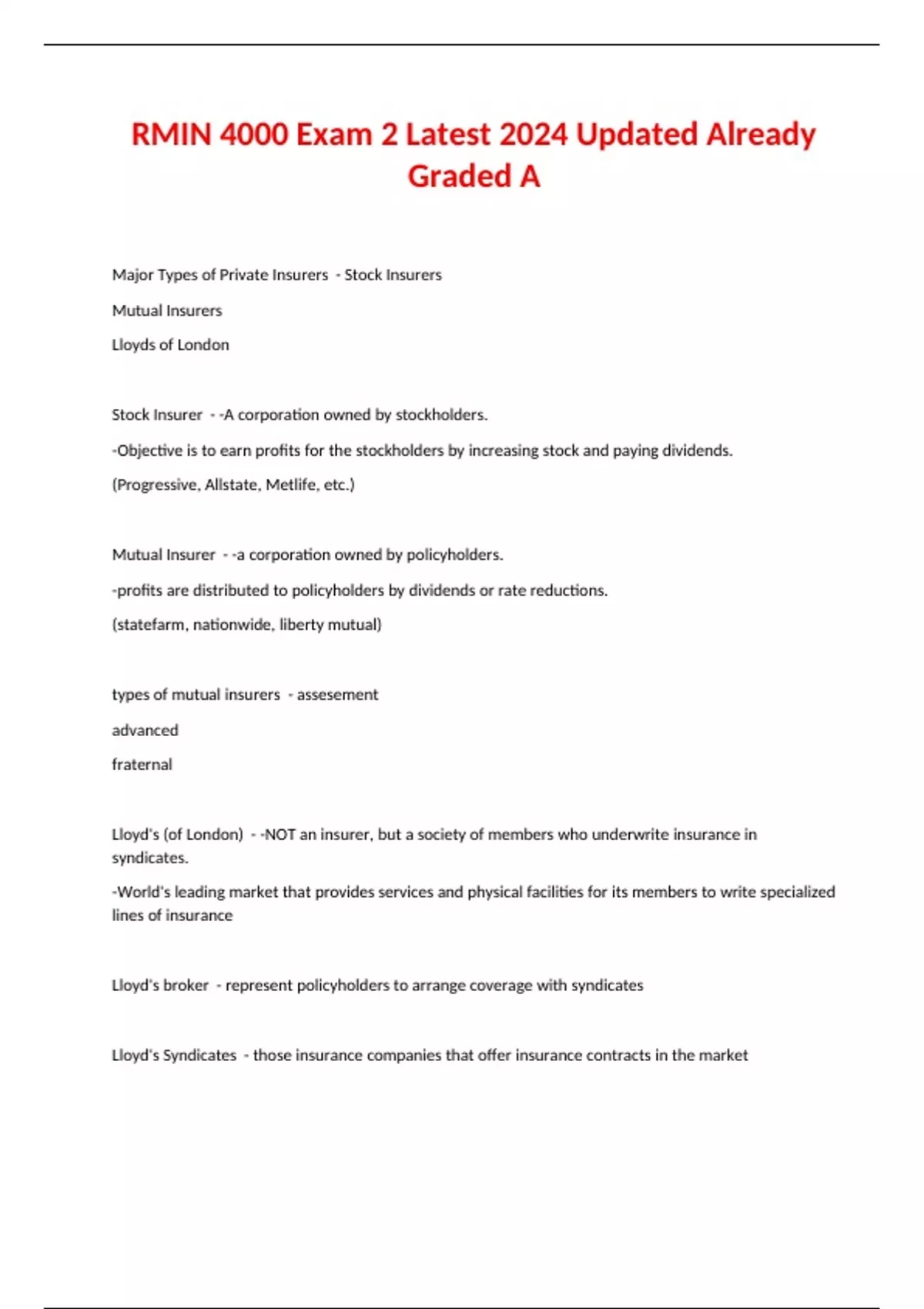 RMIN 4000 Exam 2 Latest 2024 Updated Already Graded A Major Types of Private Insurers - Stock Insurers Mutual Insurers Lloyds of London