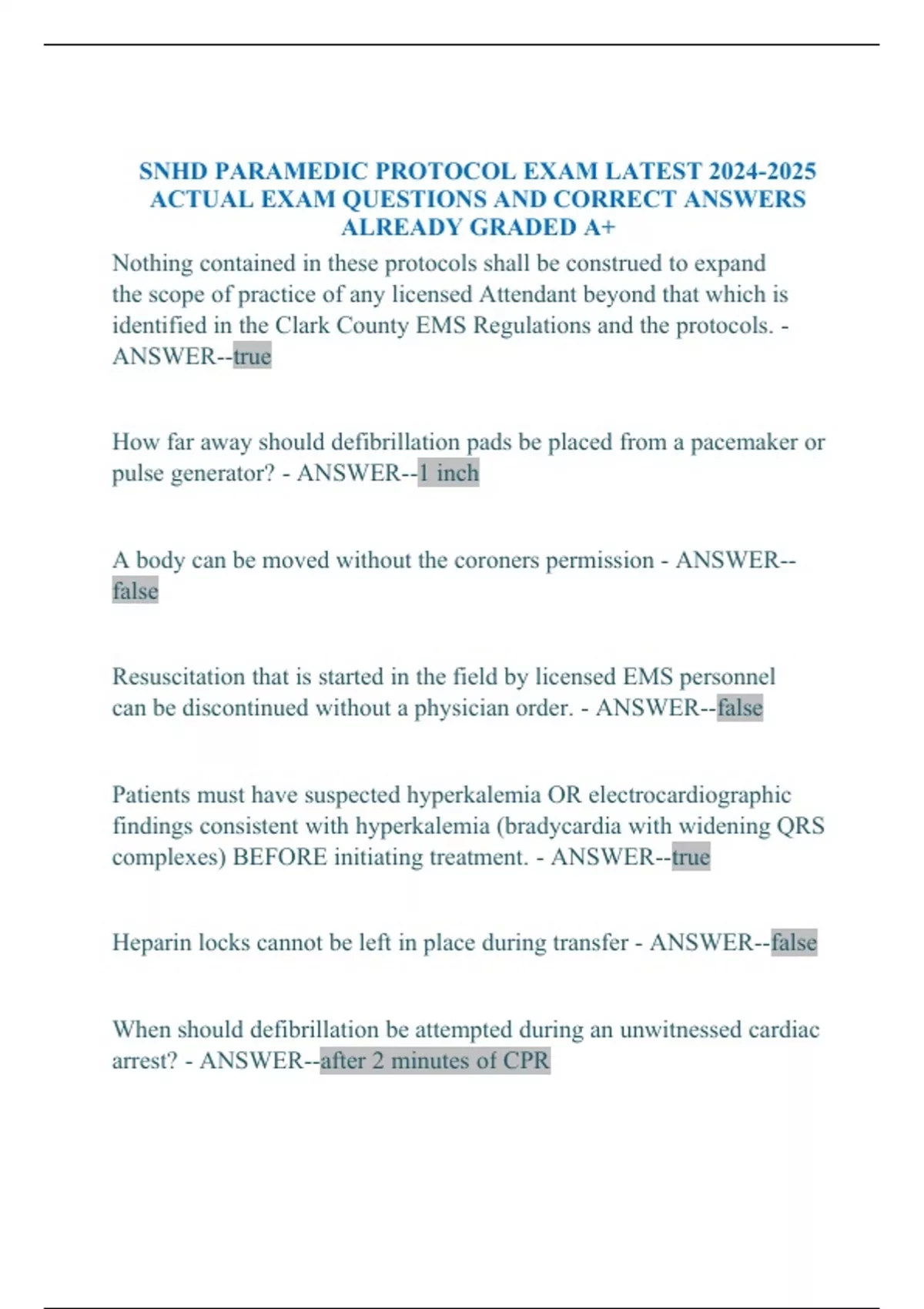 SNHD PARAMEDIC PROTOCOL EXAM LATEST ACTUAL EXAM QUESTIONS AND CORRECT ANSWERS ALREADY GRADED A+ Nothing contained in these protocols shall be construed to expand the scope of practice of any licensed Attendant beyond that which is identified in the Clark County EMS Regulations and the protocols. - ANSWER--true