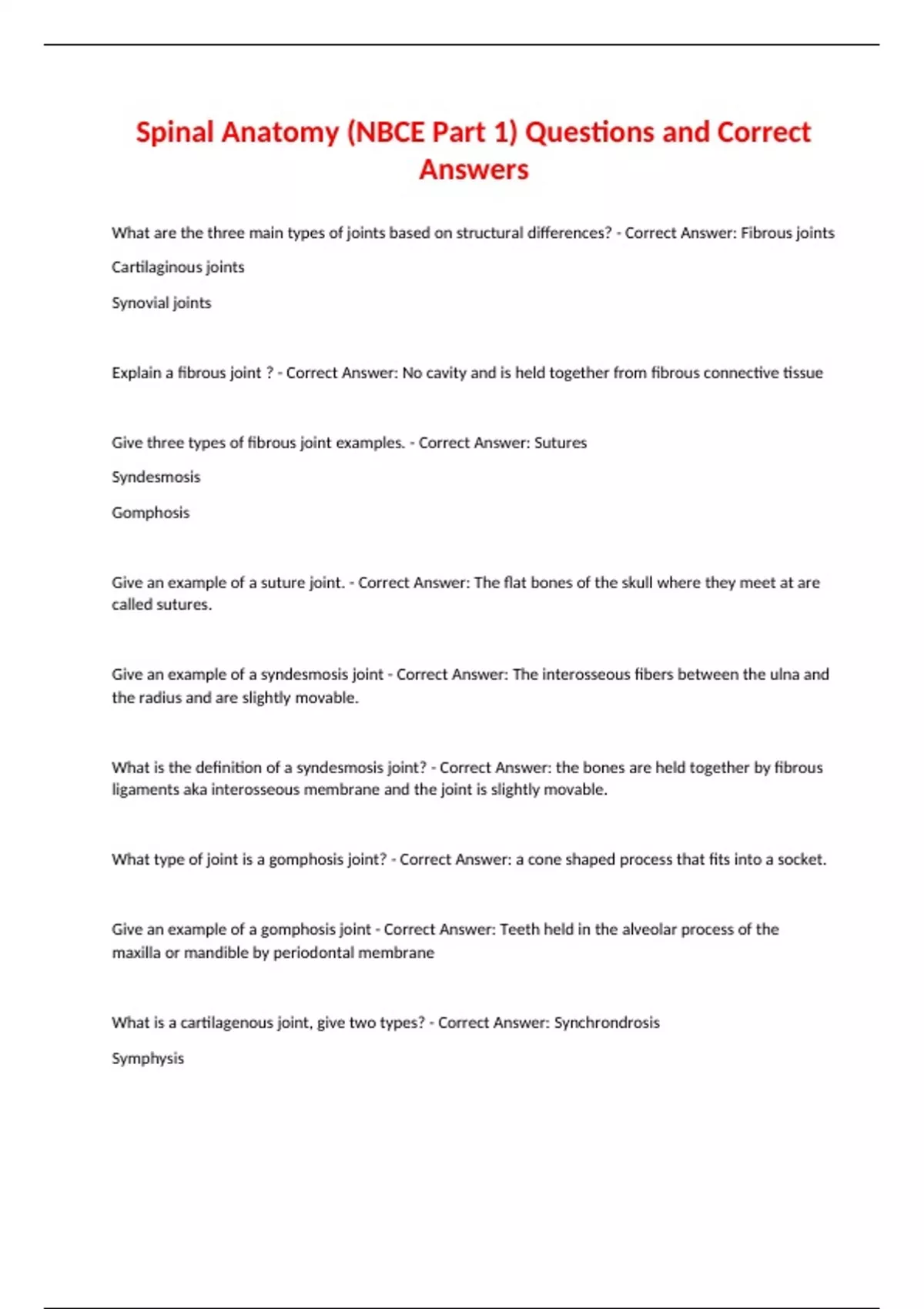 Spinal Anatomy (NBCE Part 1) Questions and Correct Answers What are the three main types of joints based on structural differences? - Correct Answer: Fibrous joints Cartilaginous joints Synovial joints
