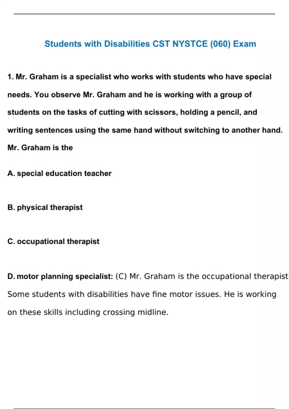 Students with Disabilities CST NYSTCE (060) Exam 1. Mr. Graham is a specialist who works with students who have special needs. You observe Mr. Graham and he is working with a group of students on the tasks of cutting with scissors, holding a pencil, and writing sentences using the same hand without switching to another hand. Mr. Graham is the