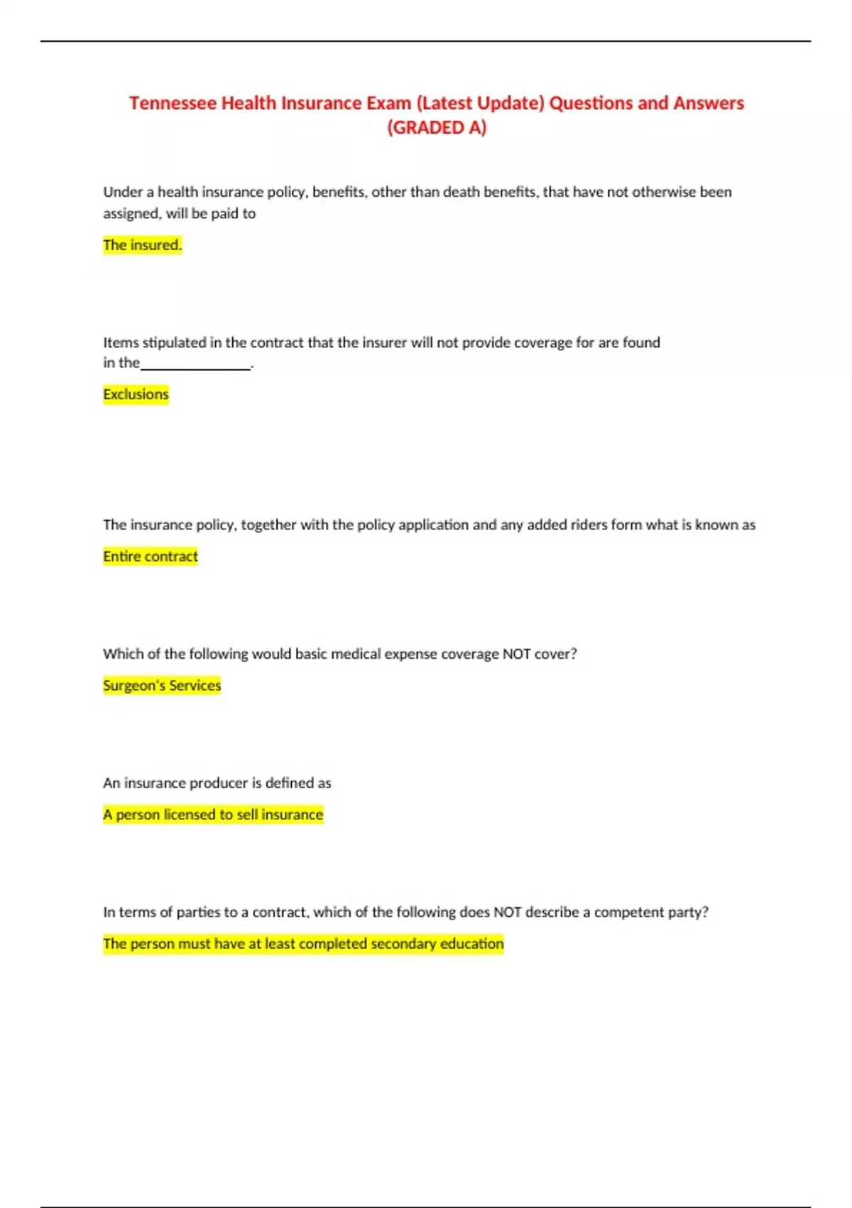 Tennessee Health Insurance Exam (Latest Update) Questions and Answers (GRADED A) Under a health insurance policy, benefits, other than death benefits, that have not otherwise been assigned, will be paid to The insured.