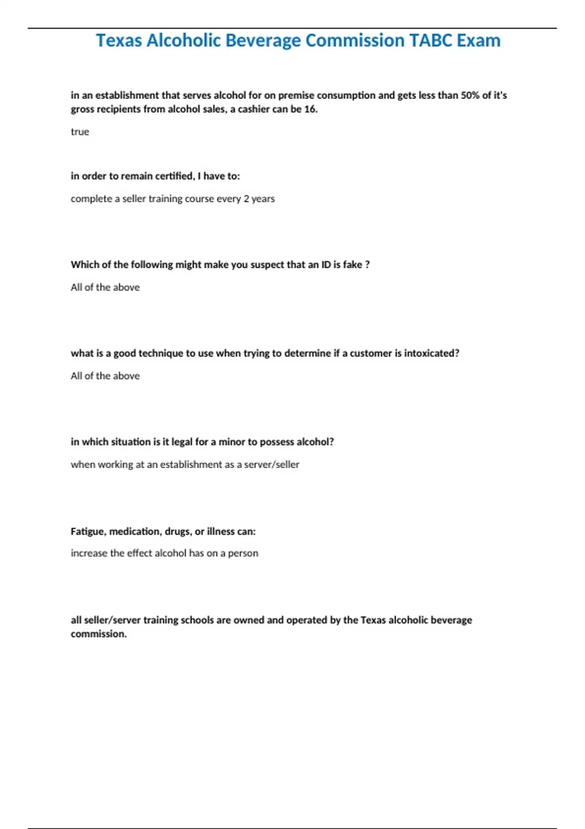 Texas Alcoholic Beverage Commission TABC Exam in an establishment that serves alcohol for on premise consumption and gets less than 50% of it's gross recipients from alcohol sales, a cashier can be 16. true