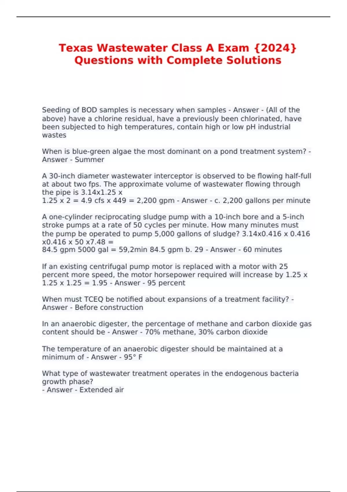 Texas Wastewater Class A Exam {2024} Questions with Complete Solutions Seeding of BOD samples is necessary when samples - Answer - (All of the above) have a chlorine residual, have a previously been chlorinated, have been subjected to high temperatures, contain high or low pH industrial wastes