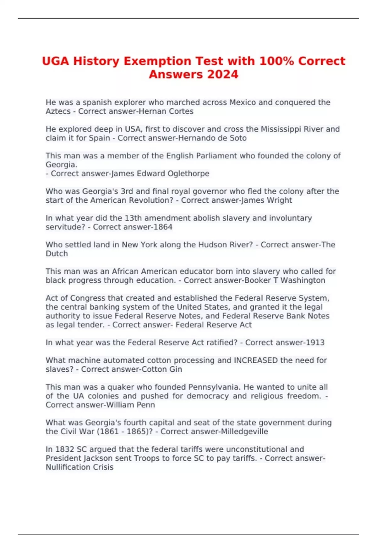 UGA History Exemption Test with 100% Correct Answers 2024 He was a spanish explorer who marched across Mexico and conquered the Aztecs - Correct answer-Hernan Cortes