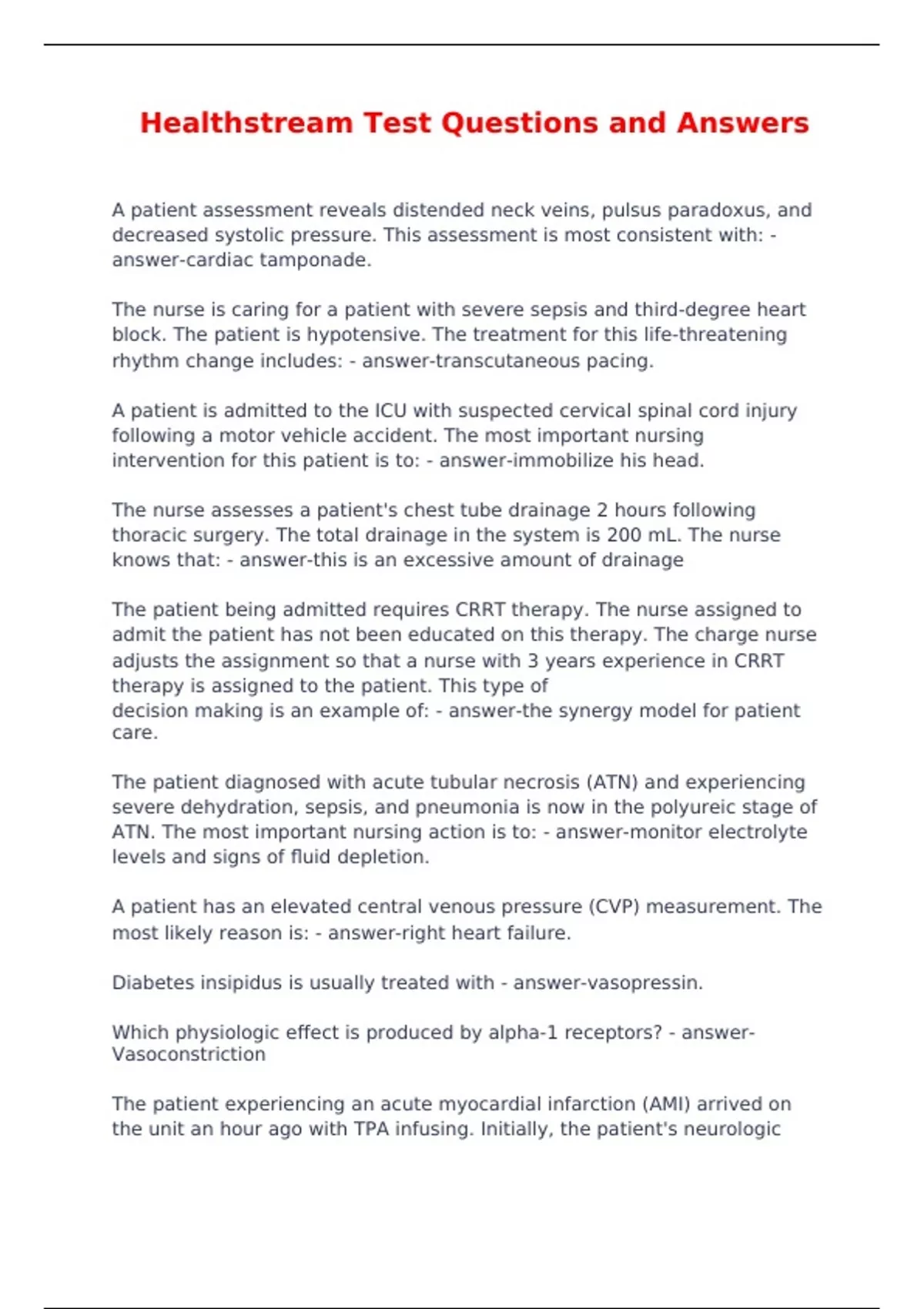 Healthstream Test Questions and Answers A patient assessment reveals distended neck veins, pulsus paradoxus, and decreased systolic pressure. This assessment is most consistent with: - answer-cardiac tamponade.
