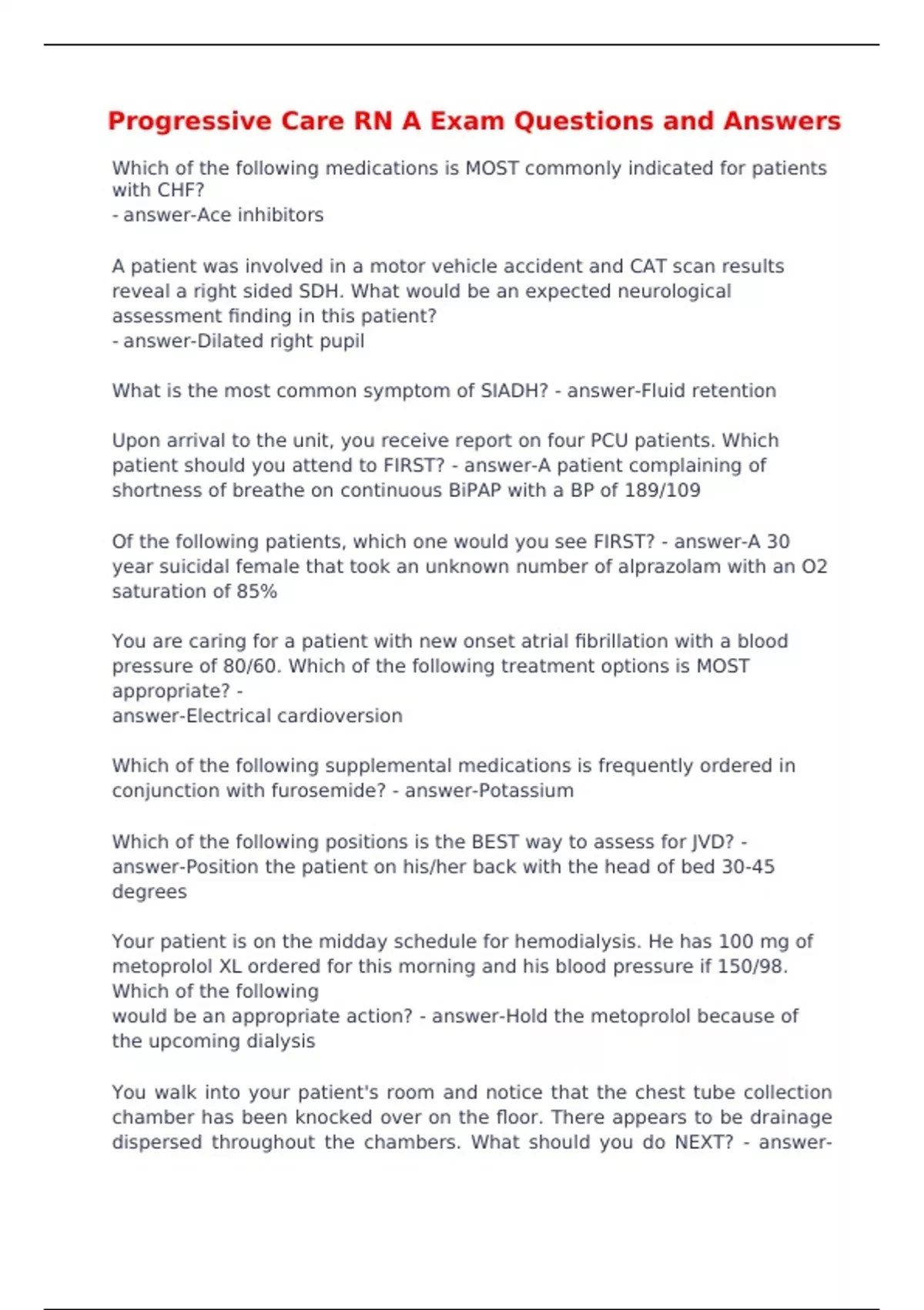 Progressive Care RN A Exam Questions and Answers Which of the following medications is MOST commonly indicated for patients with CHF? - answer-Ace inhibitors
