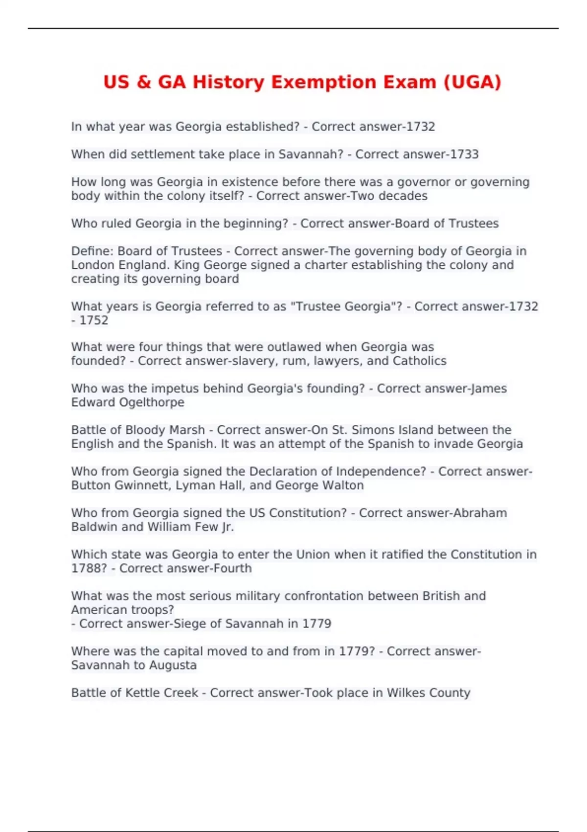 US & GA History Exemption Exam (UGA) In what year was Georgia established? - Correct answer-1732 When did settlement take place in Savannah? - Correct answer-1733