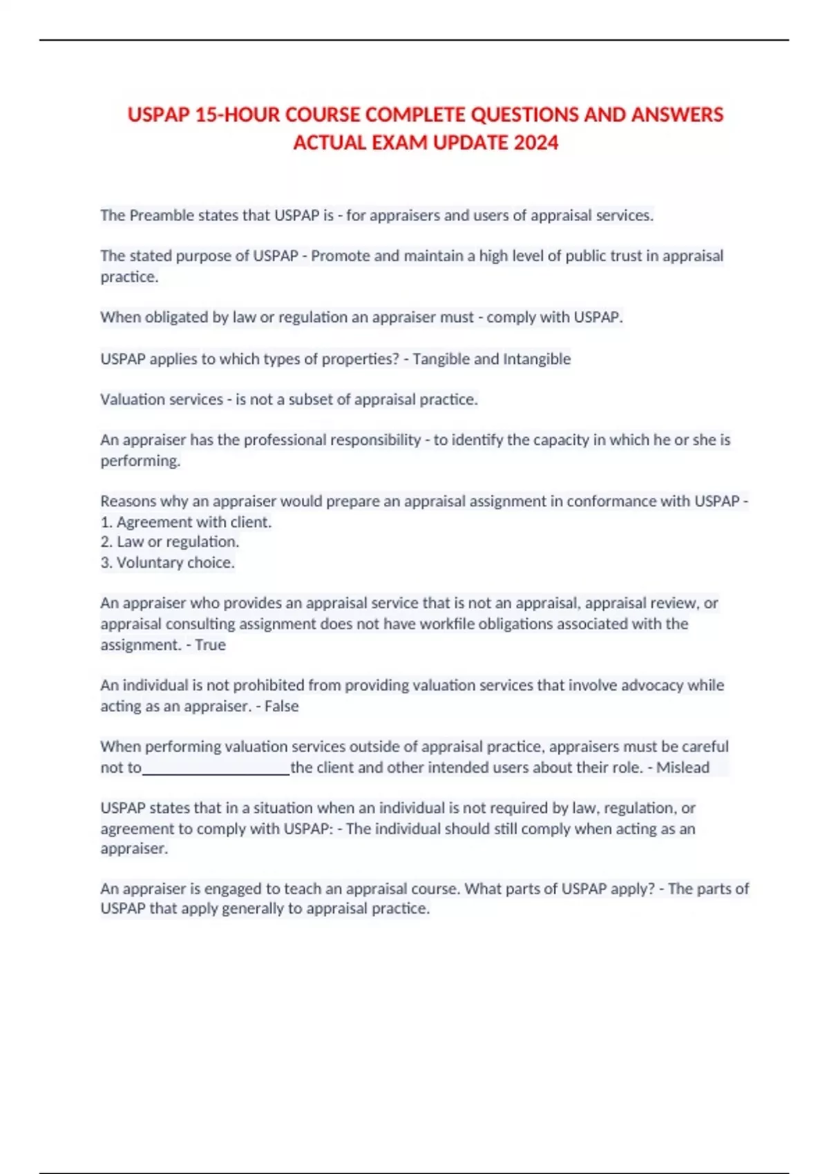USPAP 15-HOUR COURSE COMPLETE QUESTIONS AND ANSWERS ACTUAL EXAM UPDATE 2024 The Preamble states that USPAP is - for appraisers and users of appraisal services. The stated purpose of USPAP - Promote and maintain a high level of public trust in appraisal practice.