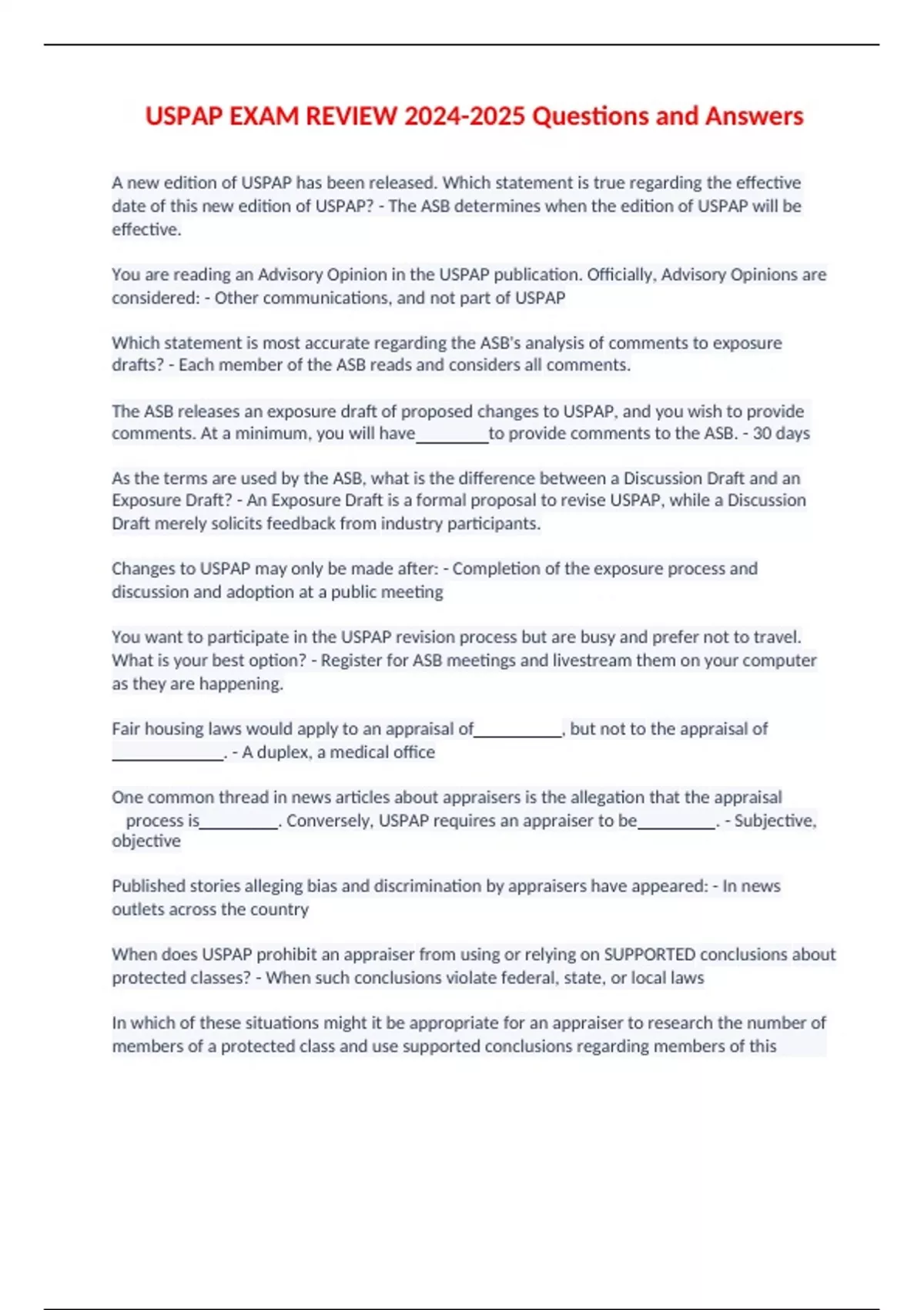USPAP EXAM REVIEW Questions and Answers A new edition of USPAP has been released. Which statement is true regarding the effective date of this new edition of USPAP? - The ASB determines when the edition of USPAP will be effective