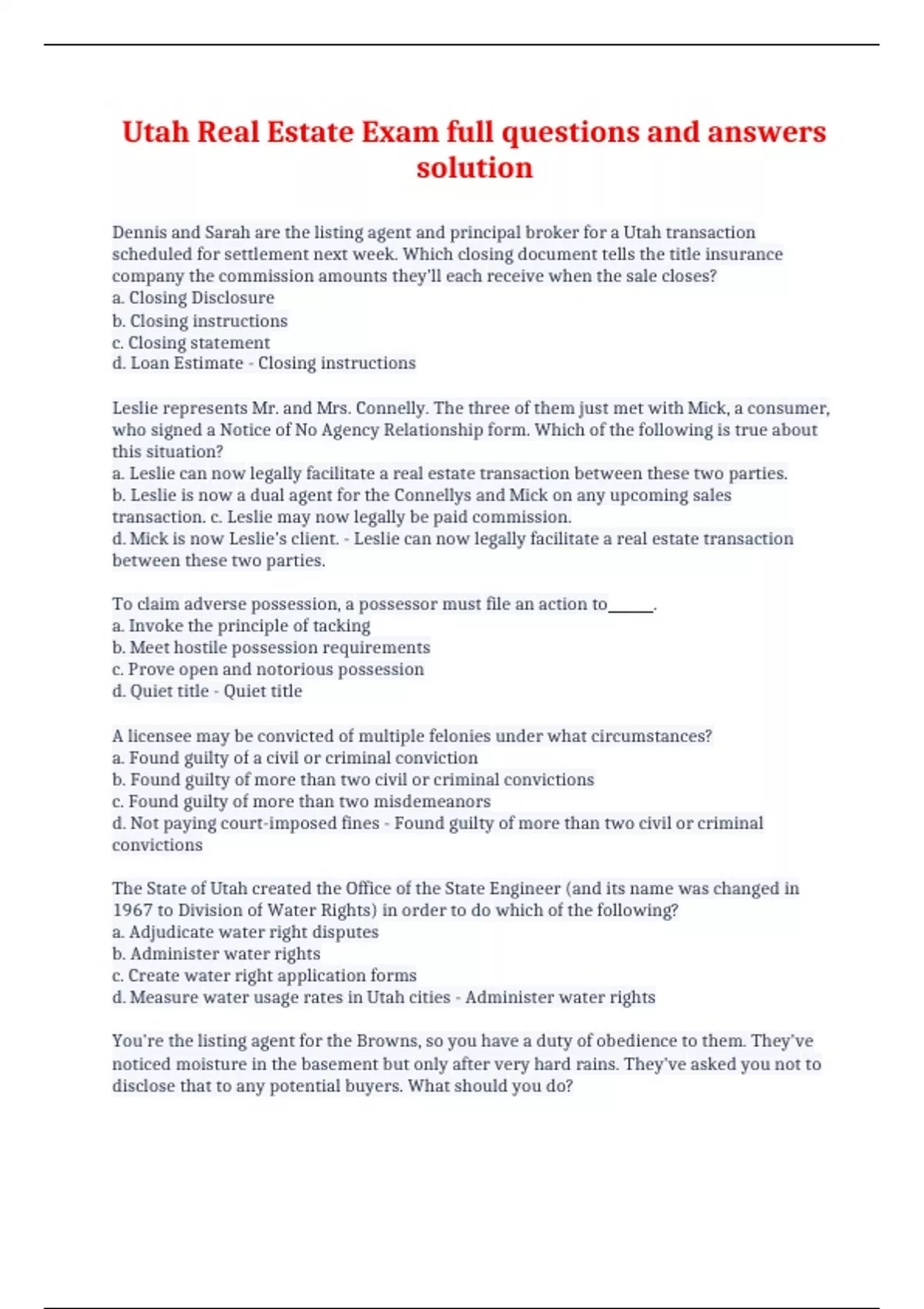 utah real estate exam full questions and answers s