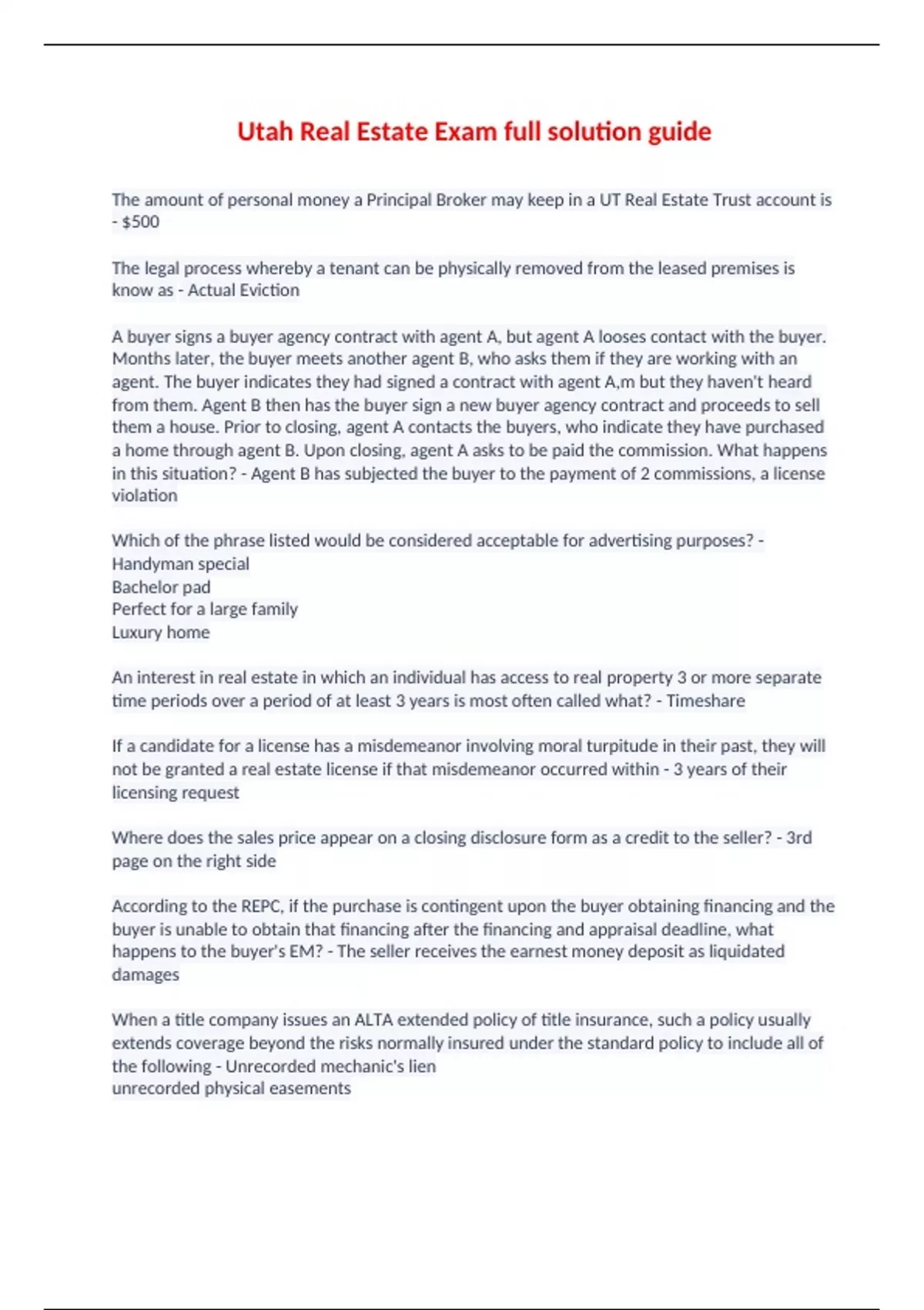 Utah Real Estate Exam full solution guide The amount of personal money a Principal Broker may keep in a UT Real Estate Trust account is - $500