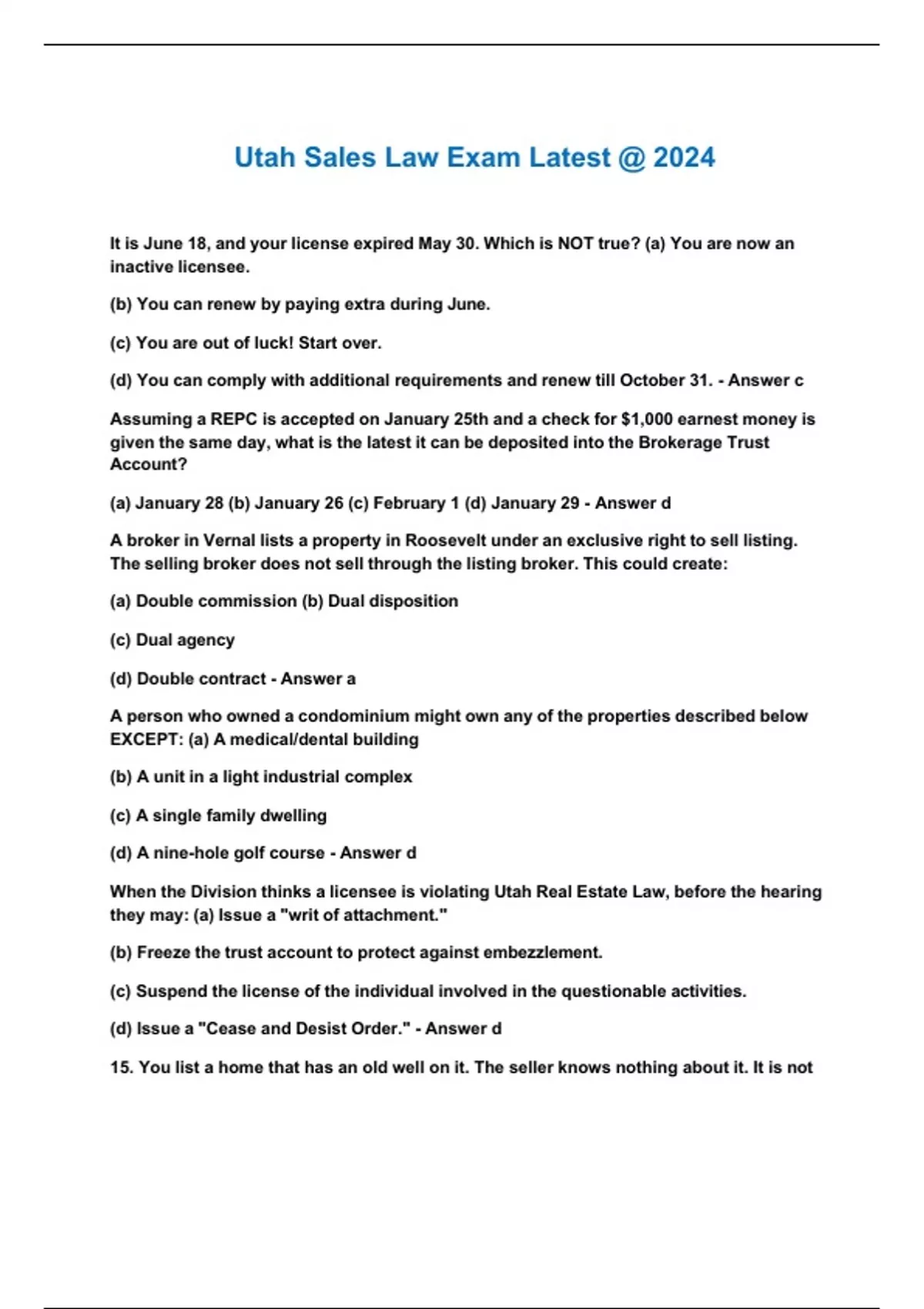 Utah Sales Law Exam Latest @ 2024 It is June 18, and your license expired May 30. Which is NOT true? (a) You are now an inactive licensee. (b) You can renew by paying extra during June. (c) You are out of luck! Start over. (d) You can comply with additional requirements and renew till October 31. - Answer c