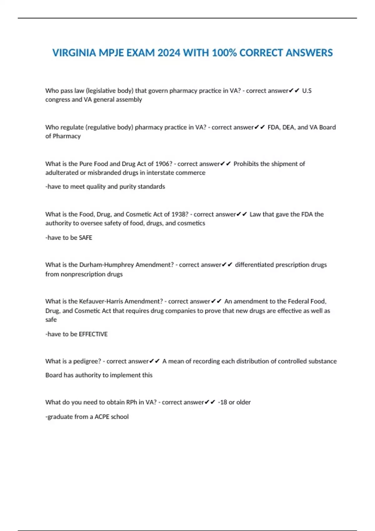VIRGINIA MPJE EXAM 2024 WITH 100% CORRECT ANSWERS Who pass law (legislative body) that govern pharmacy practice in VA? - correct answer U.S congress and VA general assembly