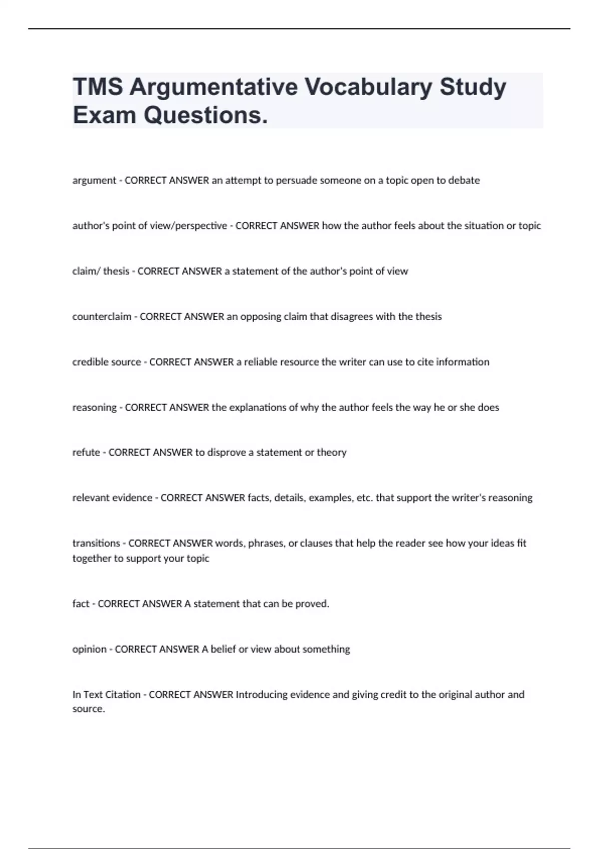 TMS Argumentative Vocabulary Study Exam Questions. argument - CORRECT ANSWER an attempt to persuade someone on a topic open to debate author's point of view/perspective - CORRECT ANSWER how the author feels about the situation or topic claim/ thesis - CORRECT ANSWER a statement of the author's point of view counterclaim - CORRECT ANSWER an opposing claim that disagrees with the thesis credible source - CORRECT ANSWER a reliable resource the writer can use to cite information reasoning - CORRECT ANSWER the explanations of why the author feels the way he or she does refute - CORRECT ANSWER to disprove a statement or theory relevant evidence - CORRECT ANSWER facts, details, examples, etc. that support the writer's reasoning transitions - CORRECT ANSWER words, phrases, or clauses that help the reader see how your ideas fit together to support your topic