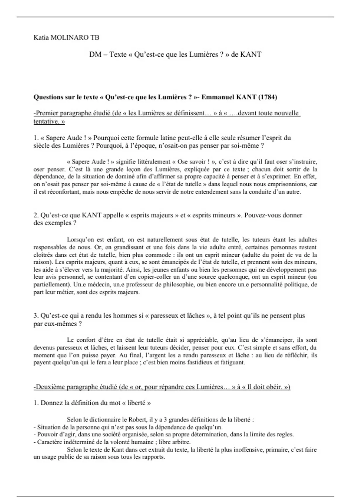 Les réponses aux questions posées, paragraphe par paragraphe, sur le texte "Qu'est-ce que les Lumières" de Kant. C'est une critique et résumé de l'oeuvre.