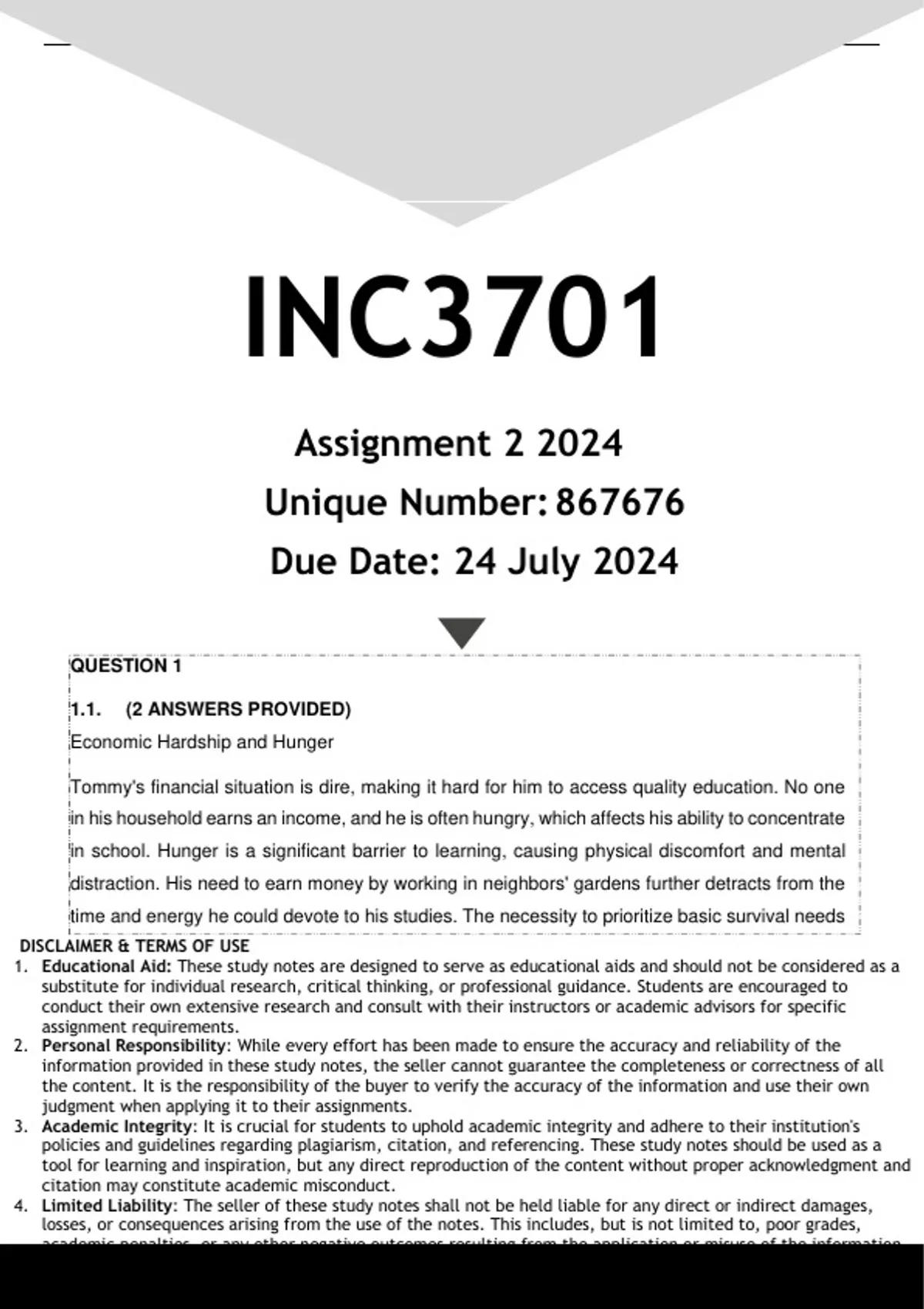 Well-structured INC3701 Assignment 4 (ANSWERS) 2024 - DISTINCTION GUARANTEED. (DETAILED ANSWERS - DISTINCTION GUARANTEED!). Question 1 Read scenario A and answer the questions that follow: INC3701/103/2024 7 Scenario A. Tommy is 10 years old. He attends a school 8 km from home. He lives in a two-room house that he shares with his mother, his 85-year-old sick grandfather and eight other children. His mother is blind and cannot find a job. Because no one in the house earns an income Tommy is often hungry. He and the other older children in the household take turns to stay home from school and care for the grandfather. His schoolwork suffers because he is not able to attend school every day. He must also fetch water from a river that is 1km from home every morning before school and is often late for school. When he is at school, he often finds it difficult to concentrate because he is usually hungry and he worries about his grandfather a lot. He is also sad because his father left home to look for work and never returned. When he gets home after a long day at school, he works in the neighbours’ garden and then sells the vegetables to earn some money to buy food for the family. The teacher does not know why Tommy comes to school late and why he is absent so often. She shouts at him for not doing his homework and for his poor performance at school. Tommy gets nervous when the teacher shouts at him, so he sits at the back of the class so that she won’t notice him. But Tommy is partially sighted and can’t see the board from the back of the class. No one knows about Tommy’s eyesight as his eyes have never been tested. His academic performance gets worse and worse. 1.1 Discuss 5 challenges that Tommy encountered in accessing quality education that prevent him from achieving his potential. Provide specific reasons mentioned in the passage to support your answer. [4x5=20] INC3701/103/2024 8 1.2 Explain the impact of Tommy's family situation on his academic performance. How does his responsibility for household tasks and caring for his grandfather affect his ability to focus on schoolwork? [4] 1.3 Highlight three (3) potential solutions or support mechanisms that could improve Tommy's academic situation. What actions could the school, teacher, or community take to address Tommy's challenges and create a more conducive learning environment for him? [6] [Sub-total=30] Question 2 Read scenario B and answer the questions that follow: Ntando set to slam dunk his way to top: Eastern Cape player only 13 but gets nod for SA U23 basketball team. By Mfundo Piliso - 19 August 2018 He is only 13, but Ntando Nokama sees his inclusion in the national U23 basketball men’s wheelchair squad as a chance to travel the world. Nokama, the youngest wheelchair Springbok in the province, represents the Eastern Cape wheelchair basketball men’s U23 side and is set to make it into the main team—Buffalo City Suns—who are campaigning in the Supersport Wheelchair Basketball National League. “I think young people should stop abusing drugs and alcohol and rather focus on playing INC3701/103/2024 9 sport and on their books because that’s how I managed to get selected to the team,” said Nokama. The “guard man” on the court said being born in Stutterheim in Mgwali, where opportunities for the disabled are few and far between, prompted his relocation to Mdantsane’s Vukuhambe Special School. “It all began here when I met the people who inspired me to play this sport,” he said. 2.1 Examine five (5) factors that contribute to Ntando Nokama's success in wheelchair basketball. In what manner has his personal attitude, choices and the support he received, played a role in his inclusion in the national U23 basketball men’s wheelchair squad? [5] 2.2 Evaluate the impact of Ntando Nokama's involvement in wheelchair basketball on his personal development and perspective. In what way has the sport influenced his life, especially considering the challenges faced by disabled individuals in Stutterheim? [5] 2.3 Analyse the significance of Ntando Nokama's inclusion in the Buffalo City Suns, the main team in the Supersport Wheelchair Basketball National League. Exactly how does this achievement contribute to the visibility and representation of disabled athletes in the sports arena? [5] 2.4 Examine the potential impact of Ntando Nokama's representation in the national U23 basketball men’s wheelchair squad on the broader community. In what ways can his success influence societal perceptions of disability and contribute to fostering a more inclusive society? [5] Sub-Total= [20] Question 3 Exercise for children appears to stimulate brain growth and boost cognitive performance. It helps them to focus. It may make it easier for them to learn and achieve. Studies suggest that physical exercise yields short- and long-term benefits for achievement in the classroom, especially when combined with an element of fun (Dewar, 2019). INC3701/103/2024 10 3.1 Identify any sports that you love the most and explain how they can support the above statement. For a well-structured answer, please provide headings and examples. [20] Name and picture of that sport [2] Definition [2] Discussion with headings (Any 4 of the following) • Physical exercise • Cognitive engagement • Focus and concentration. • Learning and achievement • Element of fun. [4 marks for each 16] Question 4 Click on : Video transcripts are provided hereunder in case you experience challenges accessing the video on the internet or Announcements. Phumlani’s journey of hope Phumlani is an 11-year-old boy from Southern Africa. He was born with HIV. Sub-Saharan Africa has the highest HIV and AIDS prevalence in the world. Living with HIV presents serious challenges for children such as Phumlani, at home and at school. At home he was deprived of the love and support of a caring family. His father had abandoned him when he was a baby and his mother had died from an A