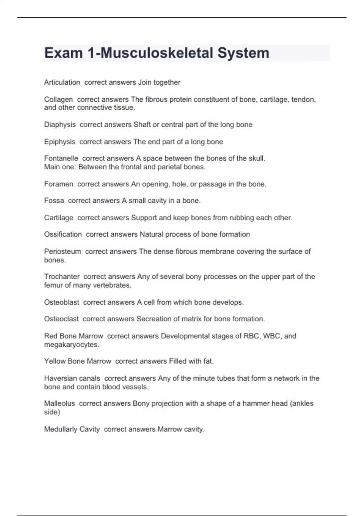 Articulation correct answers Join together Collagen correct answers The fibrous protein constituent of bone, cartilage, tendon, and other connective tissue. Diaphysis correct answers Shaft or central part of the long bone Epiphysis correct answers The end part of a long bone Fontanelle correct answers A space between the bones of the skull. Main one: Between the frontal and parietal bones. Foramen correct answers An opening, hole, or passage in the bone. Fossa correct answers A small cavity in a bone. Cartilage correct answers Support and keep bones from rubbing each other. Ossification correct answers Natural process of bone formation Periosteum correct answers The dense fibrous membrane covering the surface of bones. Trochanter correct answers Any of several bony processes on the upper part of the femur of many vertebrates. Osteoblast correct answers A cell from which bone develops. Osteoclast correct answers Secreation of matrix for bone formation. Red Bone Marrow correct answers Developmental stages of RBC, WBC, and megakaryocytes. Yellow Bone Marrow correct answers Filled with fat. Haversian canals correct answers Any of the minute tubes that form a network in the bone and contain blood vessels. Malleolus correct answers Bony projection with a shape of a hammer head (ankles side) Medullarly Cavity correct answers Marrow cavity.