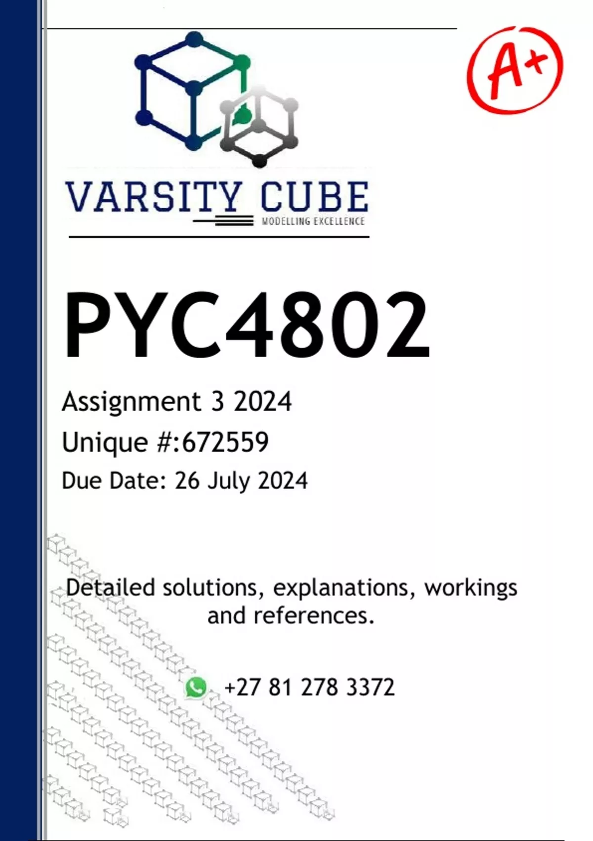 PYC4802 Assignment 3 (DETAILED ANSWERS) 2024 - DISTINCTION GUARANTEED - DISTINCTION GUARANTEED - DISTINCTION GUARANTEED Answers, guidelines, workings and references ...... a) Provide and differentiate the diagnostic criteria and hallmark features of Anorexia Nervosa, Bulimia Nervosa and Binge-eating disorder (20) b) Critically discuss how South African black females are no longer perceived to be “immune” from eating disorders (60) c) Layout of the essay and using the correct APA referencing style and for additional use of student’s own references (20)