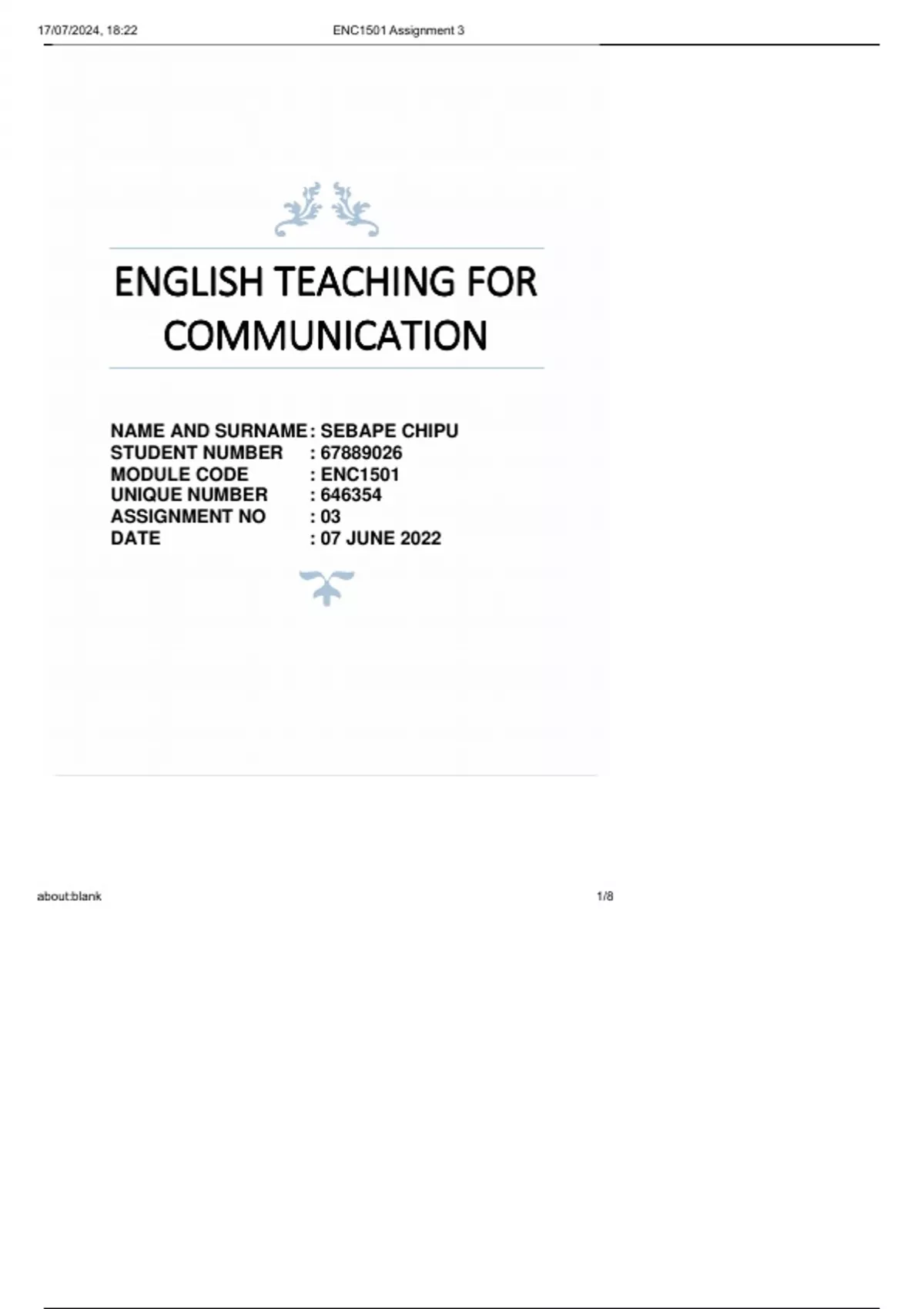 EEEEENNNNNGGGGGLLLLLIIIIISSSSSHHHHH TETETETETEAAAAACCCCCHHHHHININININING G G G G FFFFFOOOOORRRRR CCCCCOOOOOMMMMMMMMMMUUUUUNNNNNIIIIICCCCCAAAAATTTTTIOIOIOIOIONNNNN NAME AND SURNAME : SEBAPE CHIPU STUDENT NUMBER : 67889026 MODULE CODE : ENC1501 UNIQUE NUMBER : 646354 ASSIGNMENT NO 03 : DATE : 07 JUNE 2022 17/07/2024, 18:22 ENC1501 Assignment 3