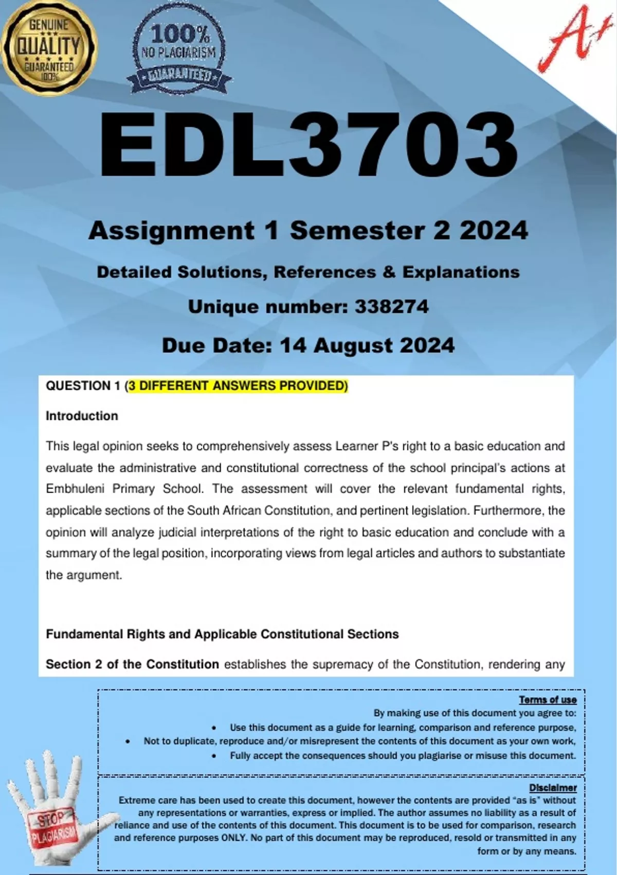 • Not to duplicate, reproduce and/or misrepresent the contents of this document as your own work,
