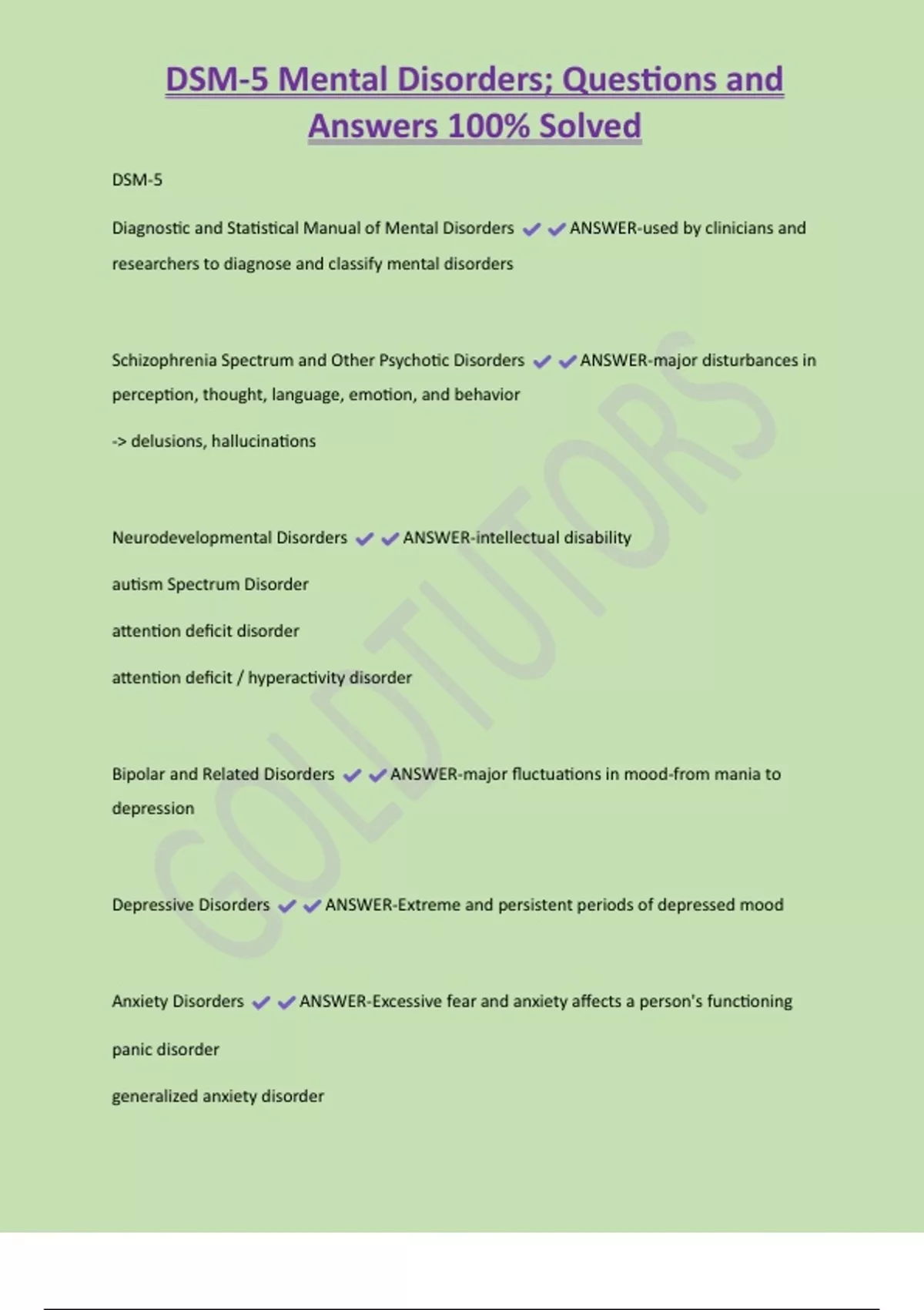 DSM-5 Mental Disorders; Questions and Answers 100% Solved DSM-5 Diagnostic and Statistical Manual of Mental Disorders ANSWER-used by clinicians and researchers to diagnose and classify mental disorders Schizophrenia Spectrum and Other Psychotic Disorders ANSWER-major disturbances in perception, thought, language, emotion, and behavior -> delusions, hallucinations Neurodevelopmental Disorders ANSWER-intellectual disability autism Spectrum Disorder attention deficit disorder attention deficit / hyperactivity disorder
