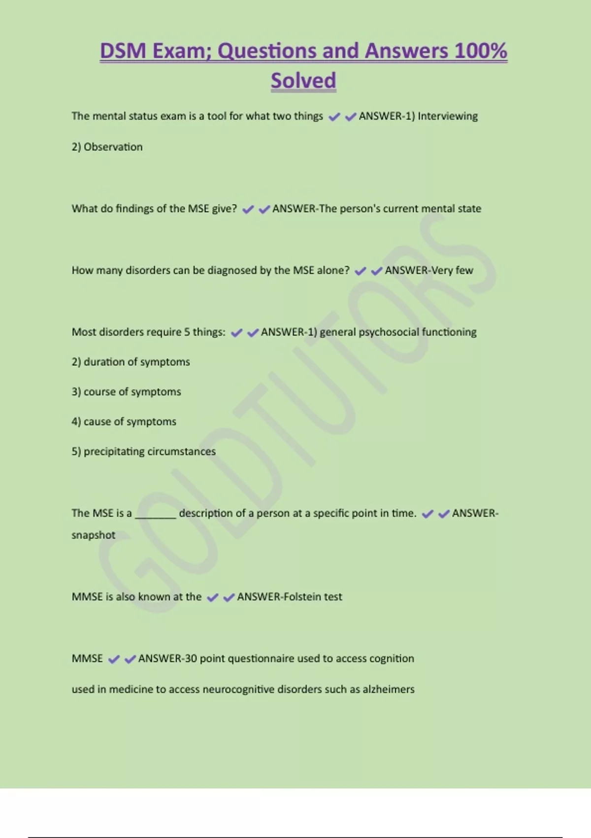 DSM Exam; Questions and Answers 100% Solved The mental status exam is a tool for what two things ANSWER-1) Interviewing 2) Observation What do findings of the MSE give? ANSWER-The person's current mental state How many disorders can be diagnosed by the MSE alone? ANSWER-Very few Most disorders require 5 things: ANSWER-1) general psychosocial functioning 2) duration of symptoms