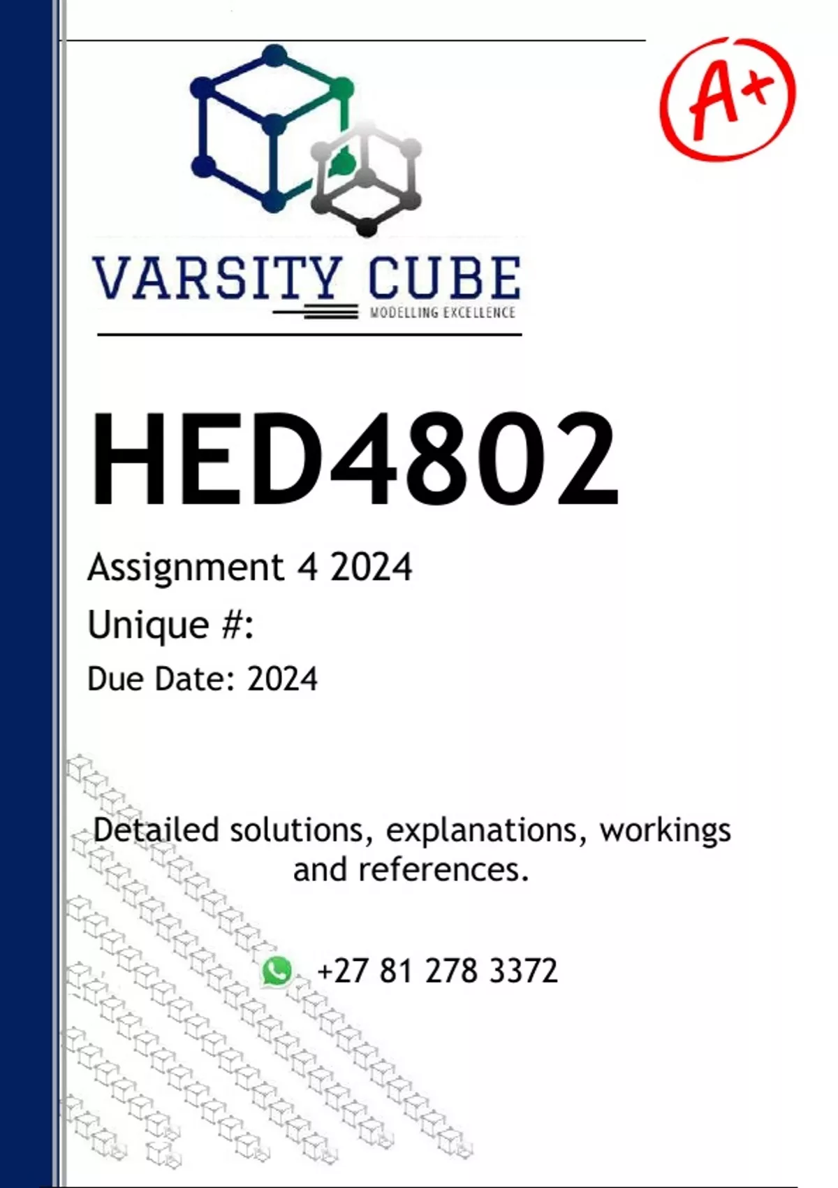 HED4802 Assignment 4 (DETAILED ANSWERS) 2024 - DISTINCTION GUARANTEED - DISTINCTION GUARANTEED - DISTINCTION GUARANTEED Answers, guidelines, workings and references ..c 1.Create a concept map on “Cosmopolitanism and Curriculum” (pages 86–89 of yourtextbook). (25) Marking guide: Criteria Description Marks Inclusion of Key Concepts Are the main concepts from pages 86 - 89 of the textbook accurately represented in the concept map? 5 Clarity and Organization Is the concept map well-structured and easy to follow, with clear relationships between concepts? 10 Accuracy of Relationships Are the connections between concepts accurate and reflective of their relationships as described in the textbook? 10 Total Marks 25 •Answer the following four (4) questions. •You may not use AI software/apps/tools to answer your assignment. •All resources that you consult must be cited in text, and you mustprovide a reference list at the end of your assignment. •Your assignment will be processed through Turnitin. You mustparaphrase all highlighted whole sentences or paragraphs. •You have three submissions available for Turnitin. All three submissionsmust be made before the due date. You do not have to use all 3submissions. •A title page must include your name, student number, module code,assignment number. •DO NOT COPY THE MARKING GUIDE INTO YOUR ASSIGNMENT – ITWILL INCREASE YOUR SIMILARITY INDEX 2. Open Educational Resources (OER) Critically analyse the benefits and challenges of using OERs for South African classrooms. Refer to a specific context in South Africa (50) Marking guide: Criteria Description Marks Understanding and Critical Analysis of OER Benefits and Challenges Provides a comprehensive and critical analysis of the benefits and challenges of using OERs in South African classrooms. Demonstrates an in-depth understanding of OERs and articulates specific benefits (e.g., cost savings, accessibility) and challenges (e.g., quality assurance, digital divide) with relevant examples and critical insight. 20 Application to Specific South African Context Clearly and effectively applies the analysis to a specific context in South Africa (e.g., urban vs. rural schools, primary vs. secondary education). Provides detailed and relevant examples illustrating how OERs are used and the particular benefits and challenges in the chosen context. 20 Structure, Clarity, and Referencing The response is well-structured, clearly written, and logically organized. Arguments flow coherently, with clear introduction, body, and conclusion. Proper referencing is used throughout, citing relevant sources correctly. 10 Total Marks 50 3. Formative Assessment Watch the following clip: 3.1 Discuss the positive and negative aspects of this formative assessment strategy. (15) 3.2 Share an innovative formative assessment technique. Start by giving the subject and grade. (10)