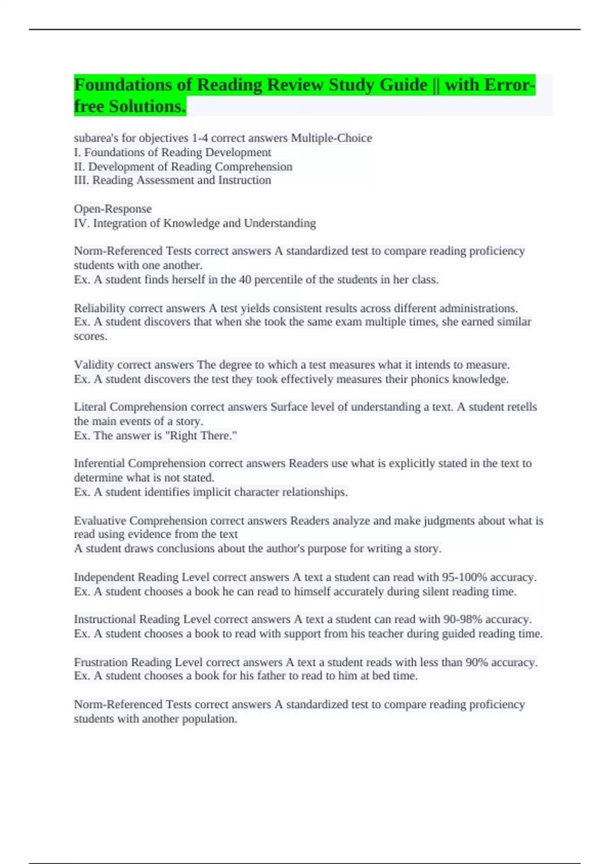 Foundations of Reading Review Study Guide || with Error-free Solutions.
