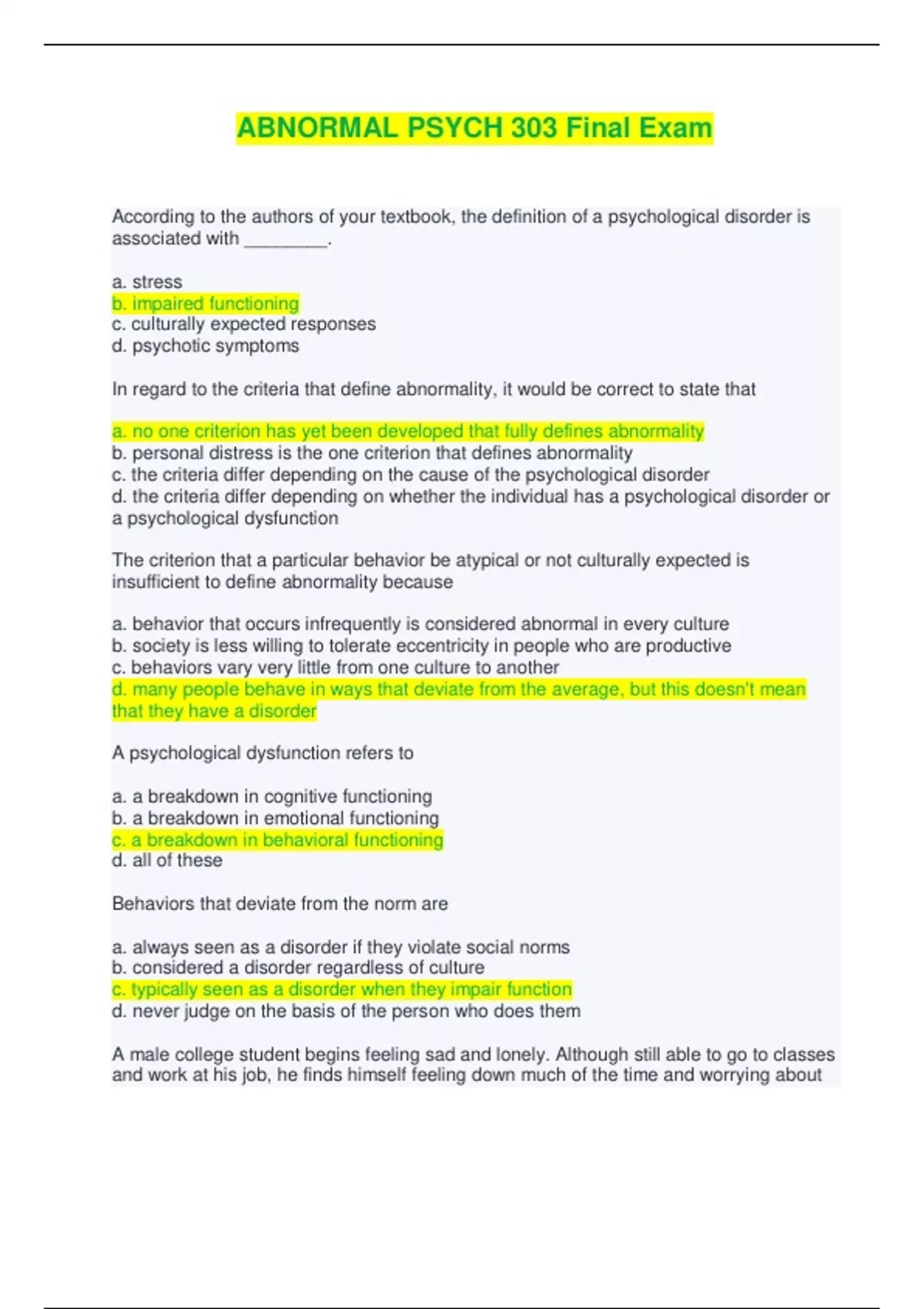 ABNORMAL PSYCH 303 Final Exam | Complete Solutions (Answered) According to the authors of your textbook, the definition of a psychological disorder is associated with ________. a. stress b. impaired functioning c. culturally expected responses d. psychotic symptoms In regard to the criteria that define abnormality, it would be correct to state that a. no one criterion has yet been developed that fully defines abnormality b. personal distress is the one criterion that defines abnormality c. the criteria differ depending on the cause of the psychological disorder d. the criteria differ depending on whether the individual has a psychological disorder or a psychological dysfunction The criterion that a particular behavior be atypical or not culturally expected is insufficient to define abnormality because a. behavior that occurs infrequently is considered abnormal in every culture b. society is less willing to tolerate eccentricity in people who are productive c. behaviors vary very little from one culture to another d. many people behave in ways that deviate from the average, but this doesn't mean that they have a disorder A psychological dysfunction refers to a. a breakdown in cognitive functioning b. a breakdown in emotional functioning c. a breakdown in behavioral functioning d. all of these Behaviors that deviate from the norm are a. always seen as a disorder if they violate social norms b. considered a disorder regardless of culture c. typically seen as a disorder when they impair function d. never judge on the basis of the person who does them A male college student begins feeling sad and lonely. Although still able to go to classes and work at his job, he finds himself feeling down much of the time and worrying about what is happening to him. Which part of the definition of abnormality applies to his situation? a. persona distress b. cultural factors c. impaired functioning d. violation of societal norms The typical profile or prototype of a disorder reflects the ___________ as described in DSM-IV. a. theoretical perspectives on abnormality b. treatments for mental disorders c. causes of mental illness d. diagnostic criteria for psychological disorders Rocky Starr is a rocker who wears outlandish female makeup and women's clothing when performing on stage. This behavior is considered a. more abnormal than that of a business man who suddenly starts to do so. b. less abnormal than that of the business man because it contributes to his job success. c. less abnormal than that of a female who wears makeup every day. d. just as abnormal as that of the business man who starts wearing makeup. The scientific study of psychological disorders is called __________. a. psychopathology b. psychoanalysis c. pseudoscience d. parapsychology After college graduation, two of your friends are interested in careers in the helping professions. Anna wants to become a psychiatrist; Carl plans on becoming a psychologist. Since you are taking a course in Abnormal Psychology, they ask you for career advice. You would tell a. Anna to apply to medical school and Carl to study psychology at the graduate level. b. Carl to apply to medical school and Anna to study psychology at the graduate level. c. both of them to apply to medical school. d. both of them to apply to graduate school. Dr. Okalemi Watabe is a mental health practioner. All of the following are ways in which she might function as a scientist-practitioner EXCEPT a. analyzing her own motivations and reasons for helping people with psychological problems. b. evaluating her own assessments and treatments for effectiveness. c. conducting research leading to new information about mental disorders and their treatments. d. using the most current diagnostic and treatment procedures. A ___________ is what first brought the individual to therapy; the ____________ represents the unique combination of behaviors, thoughts, and feelings that make up a specific disorder. a. diagnosis; symptoms b. incidence, prevalence c. clinical description; presenting problem d. presenting problem; clinical description Prevalence refers to a. how many people in the population as a whole have a disorder. b. how many new cases of a disorder occur during a given period of time. c. the percentage of males and females who have a disorder. d. how many people have recovered from a disorder in a given period of time. Incidence refers to a. how many people in the population as a whole have a disorder. b. how many new cases of a disorder occur during a given period of time. c. the percentage of males and females who have a disorder. d. how many people have recovered from a disorder in a given period of time. Statistical data are often relevant when discussing psychological disorders. For example, a researcher might want to know how many new cases of depression are diagnosed each year, a figure called the ___________ of the disorder. a. prevalence b. incidence c. recurrence d. ratio In terms of their typical course, schizophrenia follows a chronic course, while mood disorders, including depression, follow a(n) _____________ course. a. episodic b. time-limited c. guarded d. insidious A psychological disorder is said to have an acute onset if the symptoms develop __________, while it has an insidious onset if the symptoms develop __________ . a. suddenly; gradually b. suddenly; atypically c. gradually; atypically d. atypically; suddenly When Larry was diagnosed with schizophrenia, his family wanted to know how the disorder would affect him and how it would progress. In medical terms, they wanted to know Larry's _______. a. diagnosis b. prognosis c. psychosocial profile d. pathology A disorder that comes on slowly is said to have a(n) ______ onset. a. acute b. chronic c. insidious d. overt Developmental psychopatholoty refers to the study of changes in a. abnormal behavior b. normal behavior c. children's behavior, both normal and abnormal d. normal adolescent behaviro Dr. Littlefox studies the 