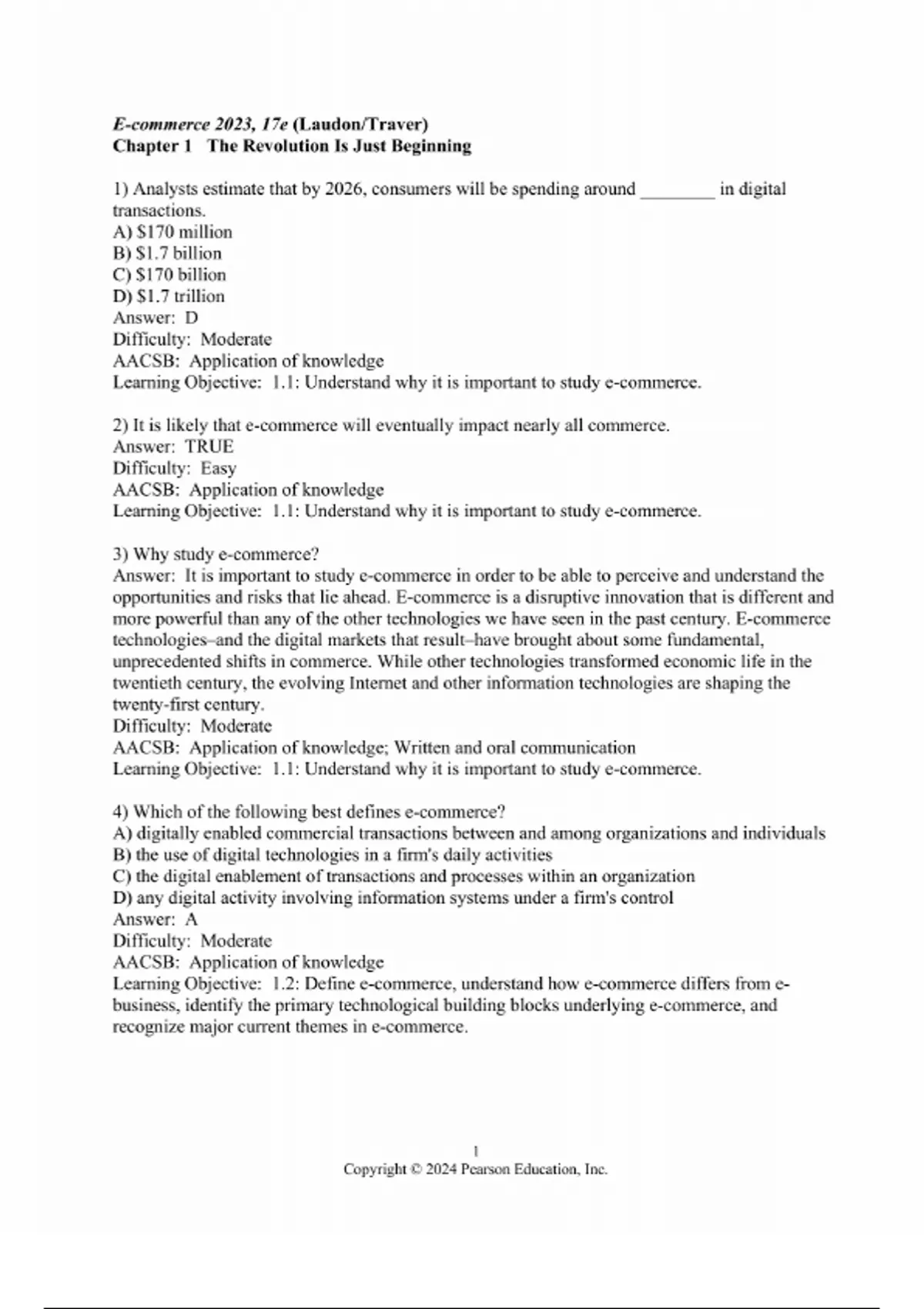 Test Bank for E-Commerce 2023: Business, Technology, Society, 17th edition 17e by Kenneth C. Laudon, Carol Guercio Traver. ISBN 2208 Full Chapters test bank included PART I: INTRODUCTION TO E-COMMERCE The Revolution is Just Beginning E-commerce Business Models and Concepts PART II: TECHNOLOGY INFRASTRUCTURE FOR E-COMMERCE E-commerce Infrastructure: The Internet, the Web, and the Mobile Platform Building an E-commerce Presence: Websites, Mobile Sites, and Apps E-commerce Security and Payment Systems PART III: BUSINESS CONCEPTS AND SOCIAL ISSUES E-commerce Marketing and Advertising Concepts Social, Mobile, and Local Marketing Ethical, Social, and Political Issues in E-commerce PART VI: E-COMMERCE IN ACTION Online Retail and Services Online Content and Media Social Networks, Auctions, and Portals B2B E-commerce: Supply Chain Management and Collaborative Commerce