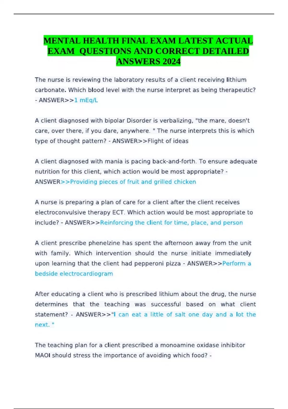 MENTAL HEALTH FINAL EXAM LATEST ACTUAL EXAM QUESTIONS AND CORRECT DETAILED ANSWERS 2024