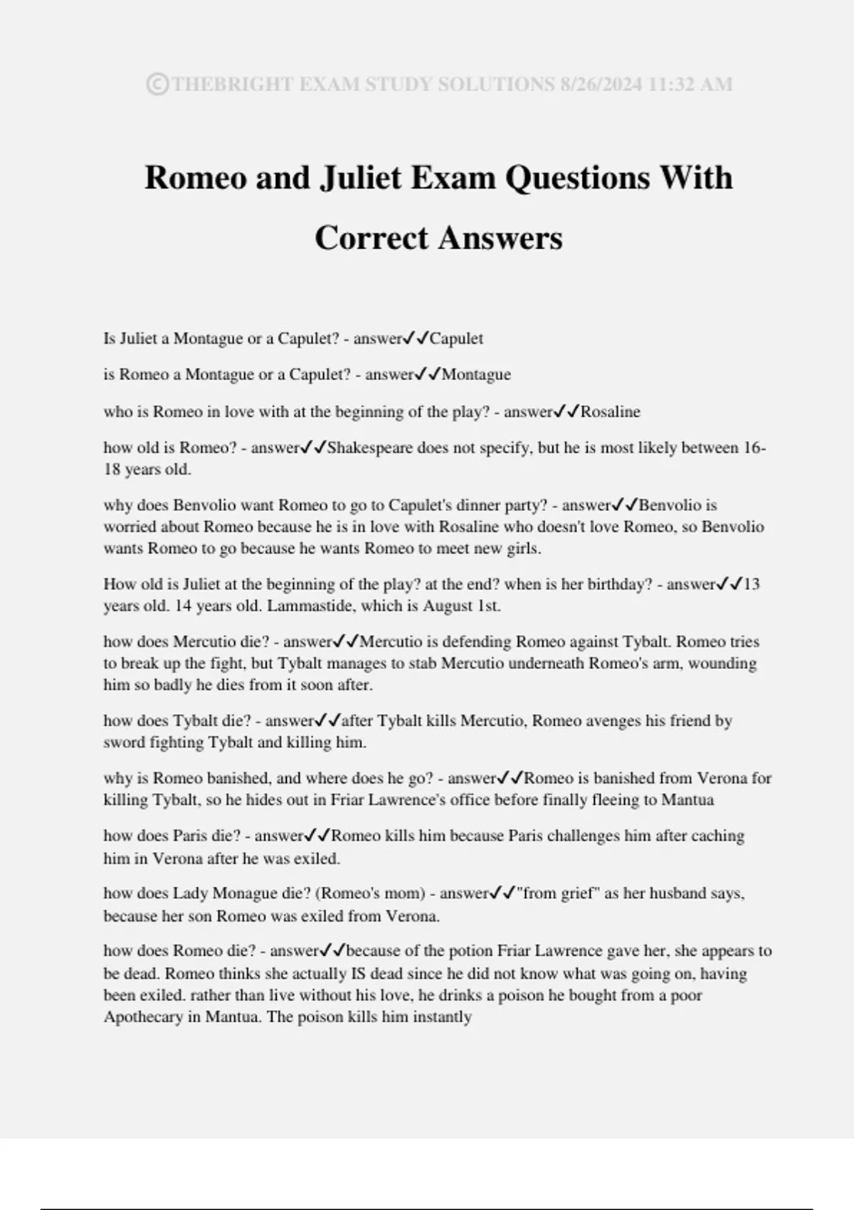 Romeo and Juliet Exam Questions With Correct Answers