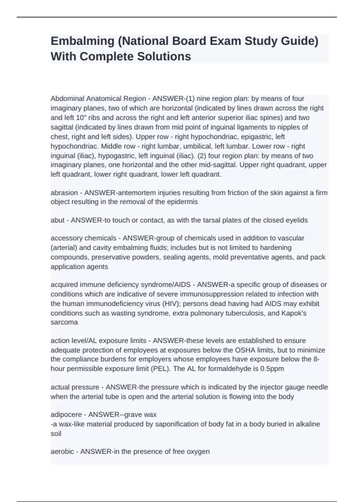 Abdominal Anatomical Region - ANSWER-(1) nine region plan: by means of four imaginary planes, two of which are horizontal (indicated by lines drawn across the right and left 10" ribs and across the right and left anterior superior iliac spines) and two sagittal (indicated by lines drawn from mid point of inguinal ligaments to nipples of chest, right and left sides). Upper row - right hypochondriac, epigastric, left hypochondriac. Middle row - right lumbar, umbilical, left lumbar. Lower row - right inguinal (iliac), hypogastric, left inguinal (iliac). (2) four region plan: by means of two imaginary planes, one horizontal and the other mid-sagittal. Upper right quadrant, upper left quadrant, lower right quadrant, lower left quadrant. abrasion - ANSWER-antemortem injuries resulting from friction of the skin against a firm object resulting in the removal of the epidermis abut - ANSWER-to touch or contact, as with the tarsal plates of the closed eyelids accessory chemicals - ANSWER-group of chemicals used in addition to vascular (arterial) and cavity embalming fluids; includes but is not limited to hardening compounds, preservative powders, sealing agents, mold preventative agents, and pack application agents acquired immune deficiency syndrome/AIDS - ANSWER-a specific group of diseases or conditions which are indicative of severe immunosuppression related to infection with the human immunodeficiency virus (HIV); persons dead having had AIDS may exhibit conditions such as wasting syndrome, extra pulmonary tuberculosis, and Kapok's sarcoma action level/AL exposure limits - ANSWER-these levels are established to ensure adequate protection of employees at exposures below the OSHA limits, but to minimize the compliance burdens for employers whose employees have exposure below the 8-hour permissible exposure limit (PEL). The AL for formaldehyde is 0.5ppm actual pressure - ANSWER-the pressure which is indicated by the injector gauge needle when the arterial tube is open and the arterial solution is flowing into the body adipocere - ANSWER--grave wax -a wax-like material produced by saponification of body fat in a body buried in alkaline soil aerobic - ANSWER-in the presence of free oxygen aerosolization - ANSWER-to disperse as an aerosol; minute particles of blood and water become atomized and suspended in air when water under pressure meets the blood drainage or when flushing an undercover flush sink agglutination - ANSWER--congealing -intravascular, the increase of viscosity of blood brought about by the clumping of particulate formed elements in the blood vessels agonal algor - ANSWER-decrease in body temperature immediately before death agonal coagulation - ANSWER--congealing -in reference to blood, a change from a fluid into a thickened mass agonal dehydration - ANSWER-the loss of moisture from the living body during the agonal state agonal edema - ANSWER-escape of blood serum from an intravascular to an extravascular location immediately before death agonal fever - ANSWER-increase in body temperature immediately before death agonal period - ANSWER-the period immediately before somatic death algor mortis - ANSWER-post mortem cooling of the body to the surrounding temperature alternate drainage - ANSWER--restricted drainage -method of injection-drainage in which embalming solution is injected and then injection is stopped while drainage is open american congress of governmental industrial hygienists/ACGIH - ANSWER-an organization of professional personnel in governmental agencies or educational institutions who are employed in occupational safety and health programs amino acid - ANSWER-the building blocks of proteins; and the end products of protein digestion or hydrolysis, it is a compound containing an amino group (-NH2), a carboxyl (-COOH) group attached to an alpha carbon and a radical anaerobic - ANSWER-in the the absence of free oxygen anasara - ANSWER-generalized massive edema is subcutaneous tissue anatomical guide - ANSWER-a descriptive reference for locating arteries and veins by means of anatomical structures which are known anatomical limits - ANSWER-points of origin and points of termination in relation to adjacent structures; used to designate the boundaries of arteries anatomical position - ANSWER-the body is erect, feet together, palms facing forward, and thumbs pointed away from the body aneurysm - ANSWER-localized abnormal dilation or out pocketing of a blood vessel resulting from a congenital defect or a weakness of a vessel wall aneurysm hook - ANSWER-an embalming instrument used for blunt dissection and in raising vessels; has an eye in the hook position of the instrument for placing ligatures around the vessels aneurysm needle - ANSWER-an embalming instrument that is used for blunt dissection and in raising vessels, which has an eye in the hook portion of the instrument for placing ligatures around the vessels