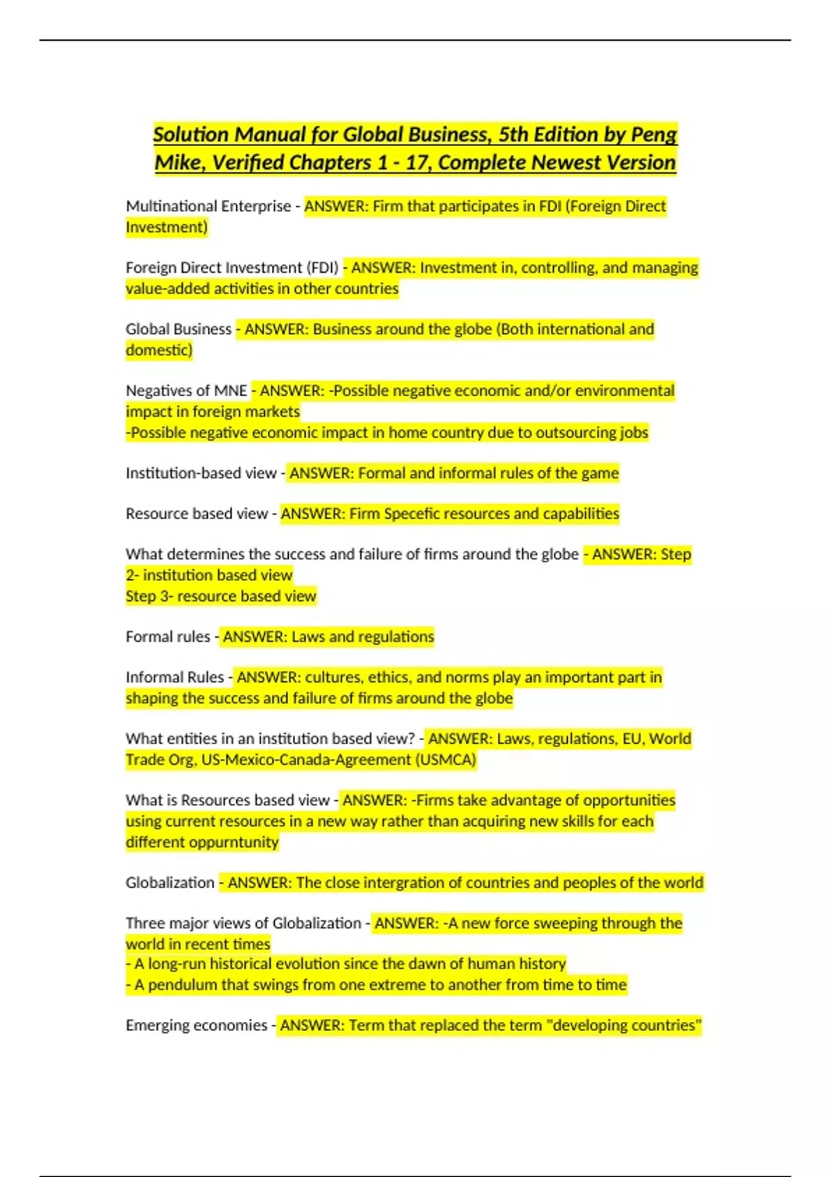 Solution Manual for Global Business, 5th Edition by Peng